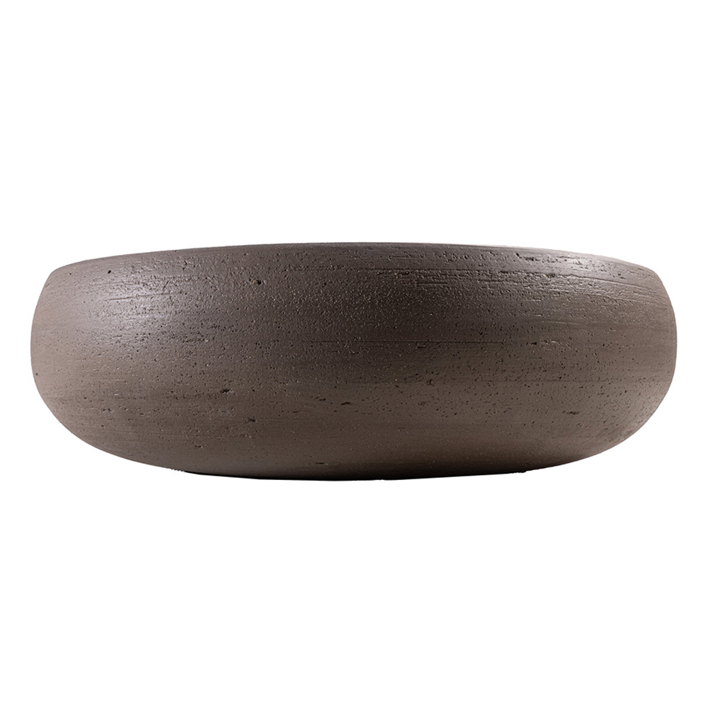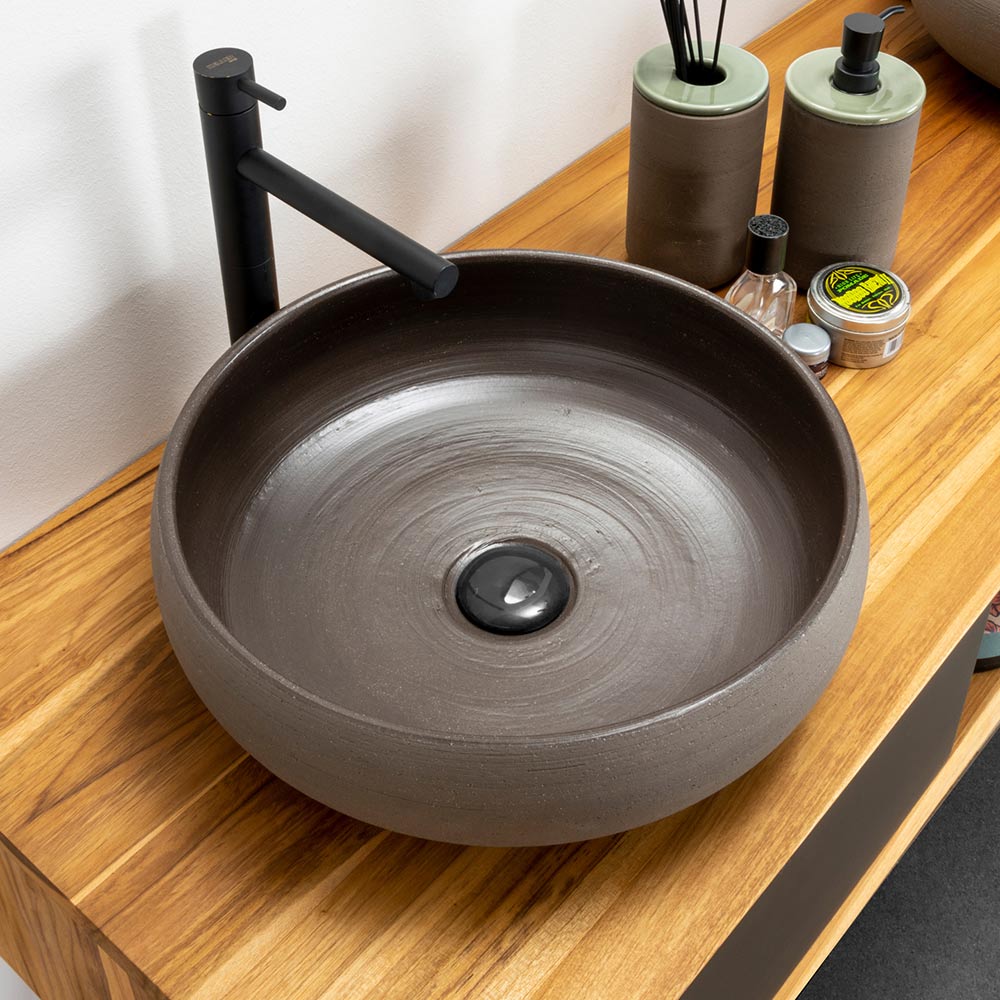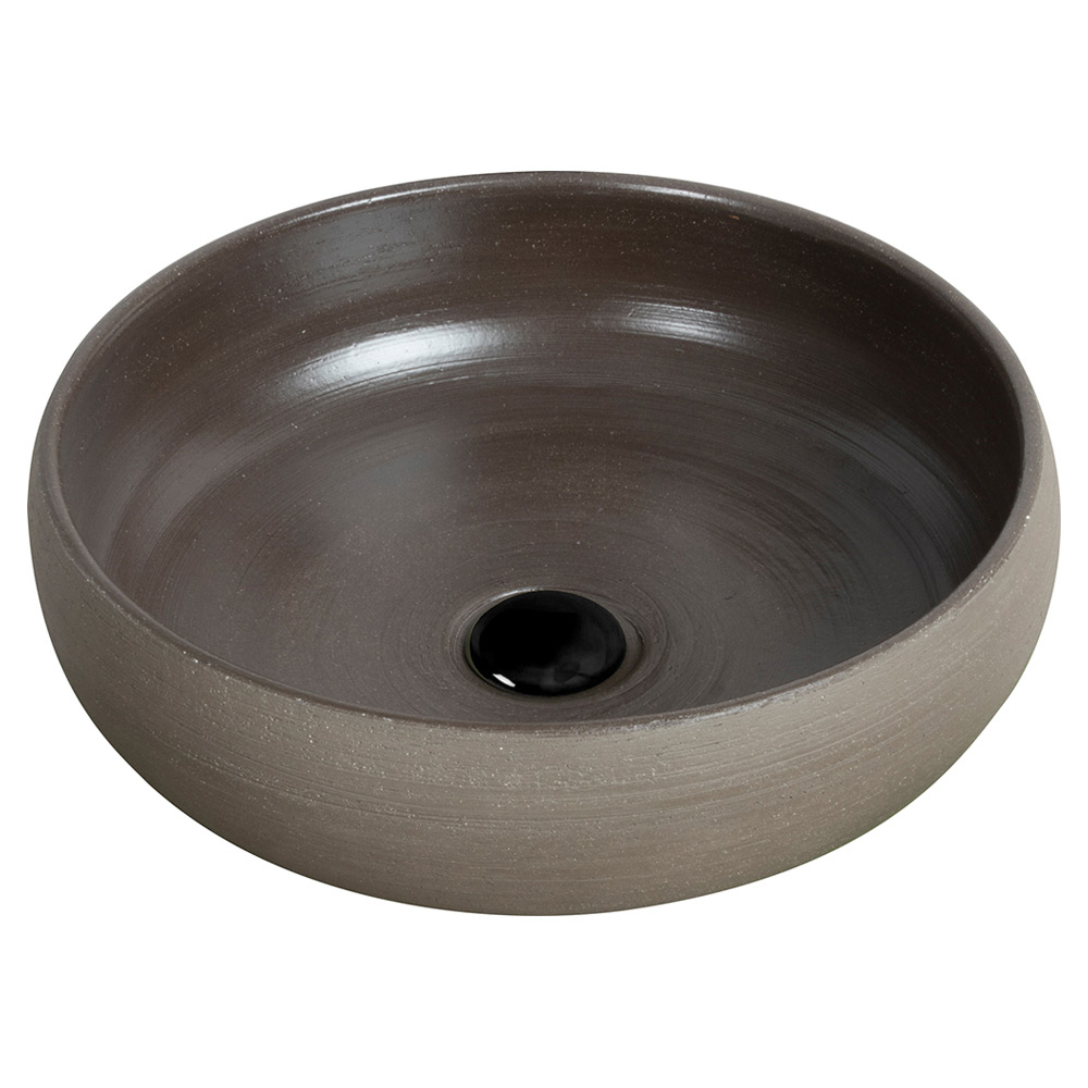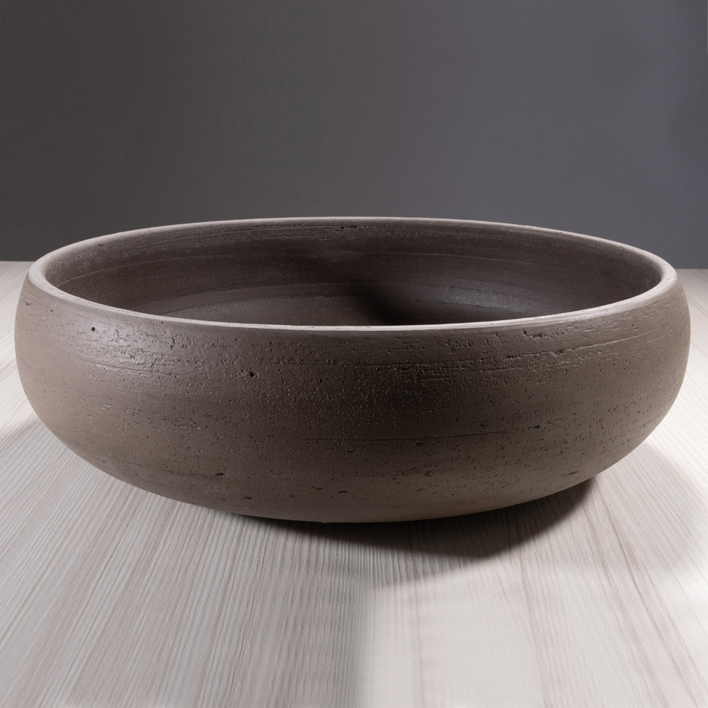 Countertop washbasin with a round shape in refractory clay and dark earth entirely made in Italy, turned by hand and fired in Third Fire. An engaging piece of furniture to the touch and sinuous in soft shapes and generous dimensions that combine style and functionality making it perfect to be positioned within any bathroom area. The rustic and elegant finish highlights the luminous character of this sink making it the protagonist and illuminating the atmosphere.