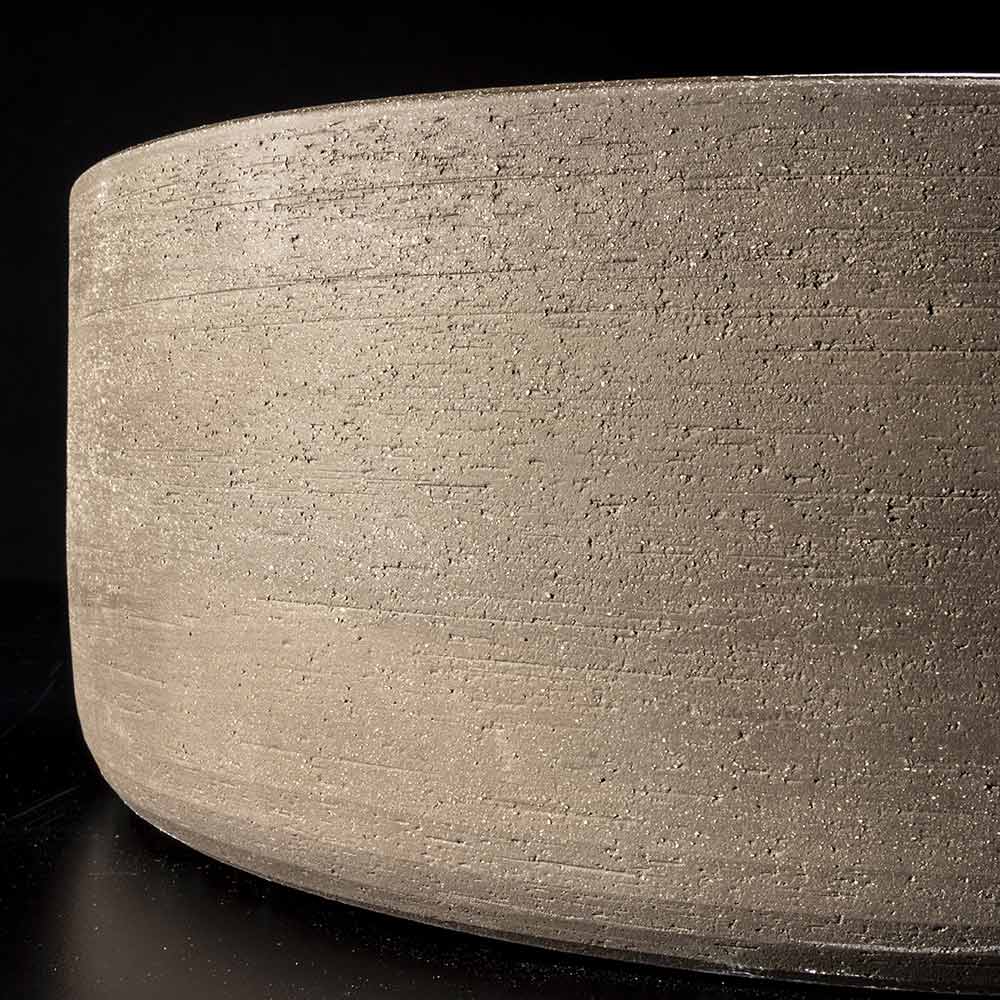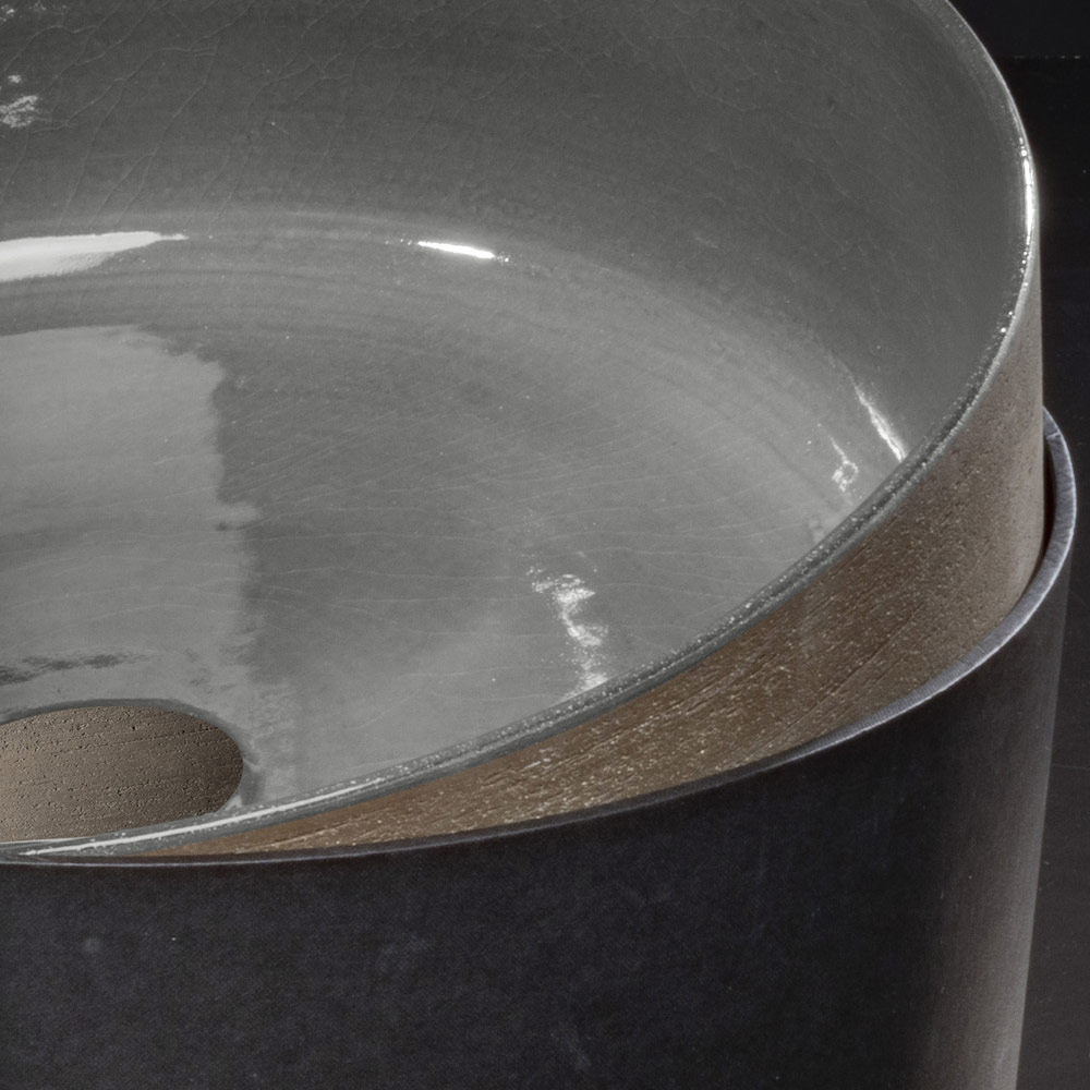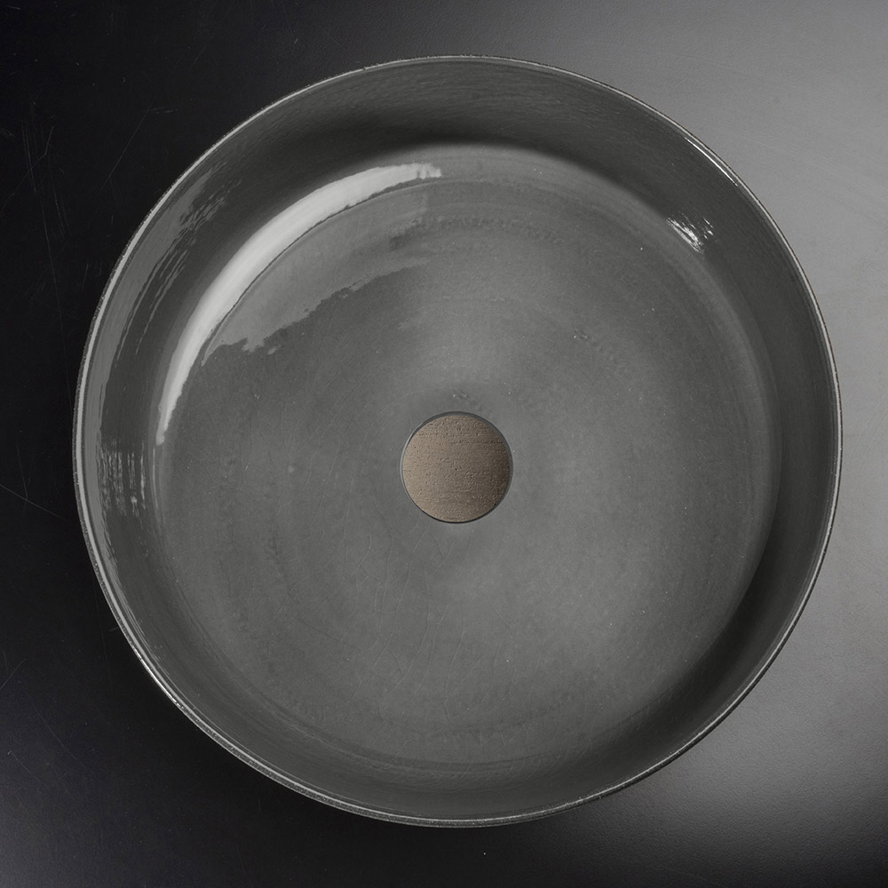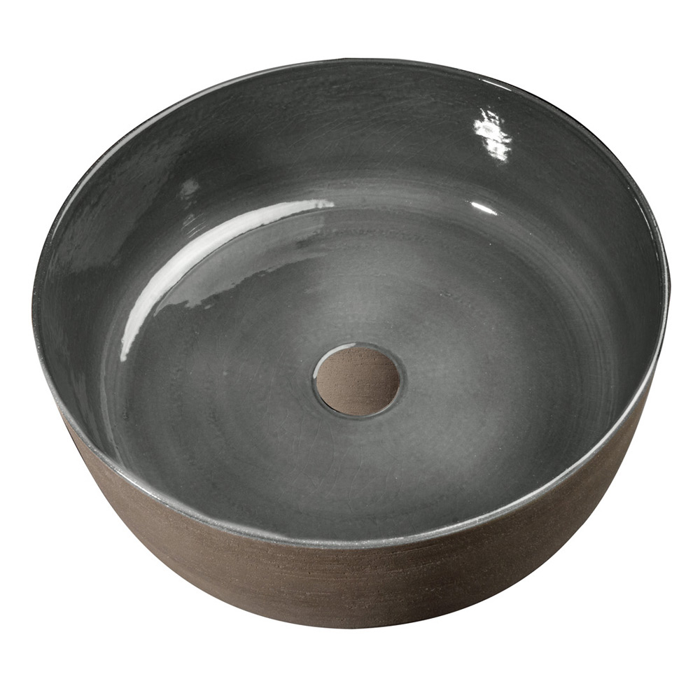 Countertop washbasin with a round shape made in Italy in refractory clay , turned by hand with third fire cooking. Its aesthetic is characterized by the perfect combination of the natural waxed and waterproofed exterior with a more rustic style and the glossy and vitrified grey finish interior, a colour that expresses elegance in a discreet and reserved way. Each element of the washbasin is handcrafted to give life to an exclusive furnishing solution, of high value and of unparalleled quality.
