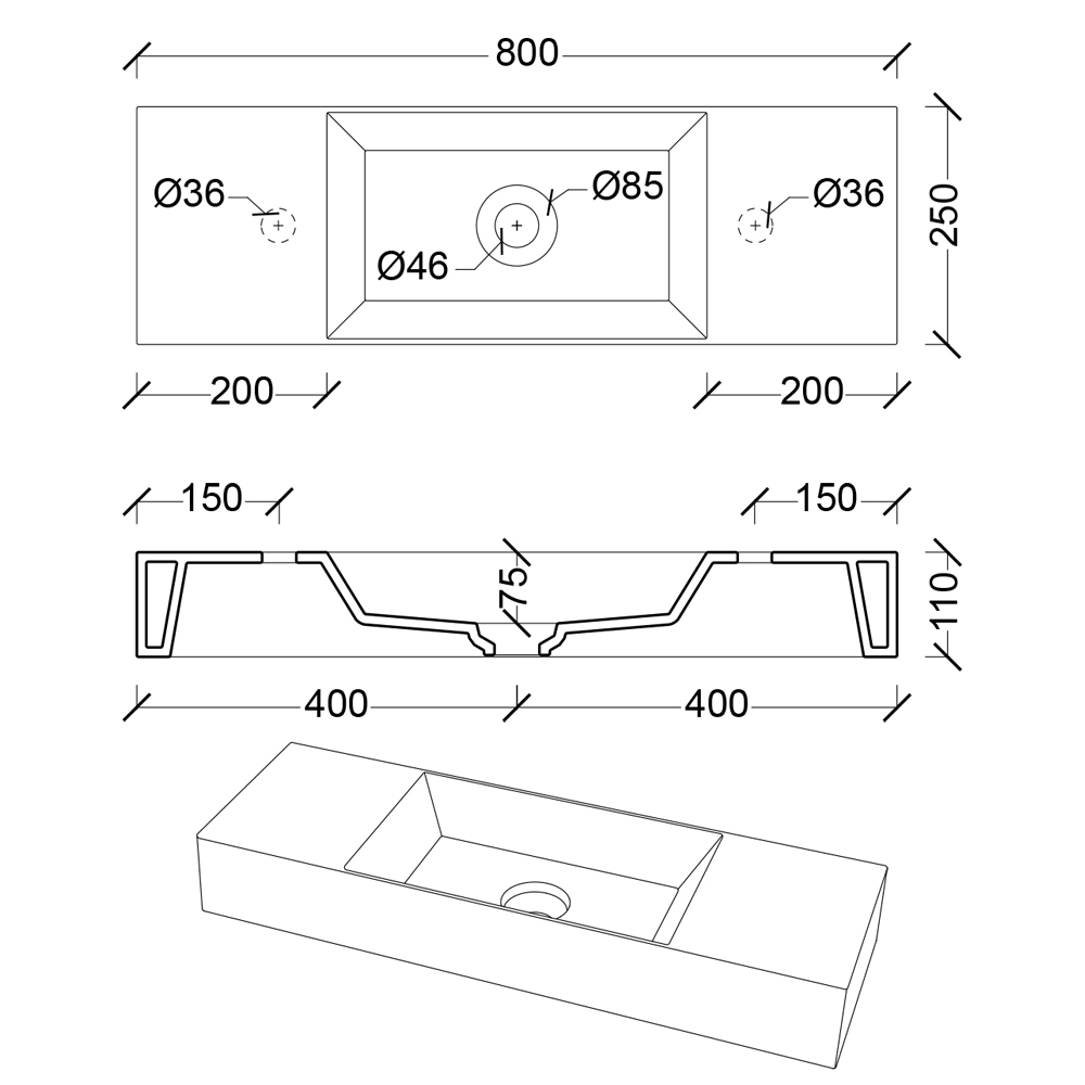NB : this item can be used both in support and suspended. Prepared for right, left or wall taps (to be specified when ordering).