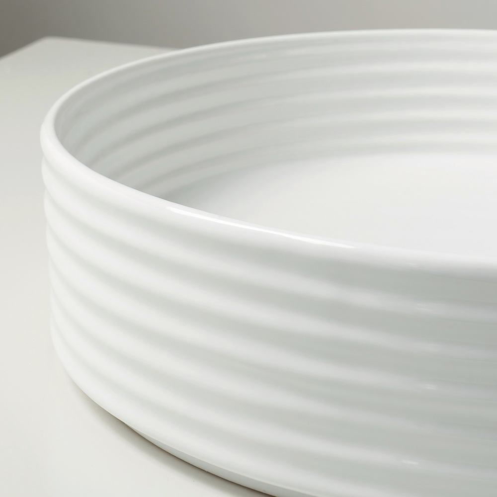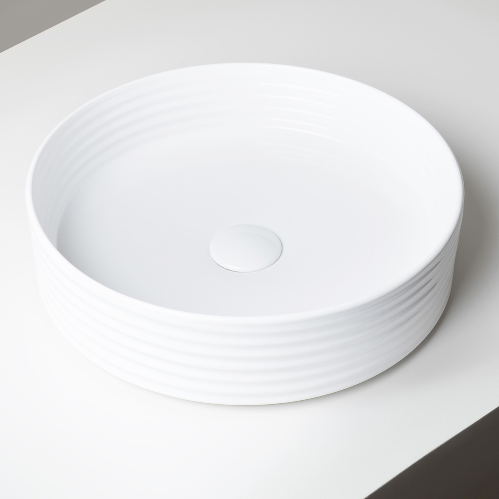 The countertop sink is made of hand-turned porcelain stoneware and represents a perfect synthesis of formal research and artisanal mastery. The wavy surfaces interact with the light, creating soft, continuous reflections that transform the material into a fluid and elegant presence.