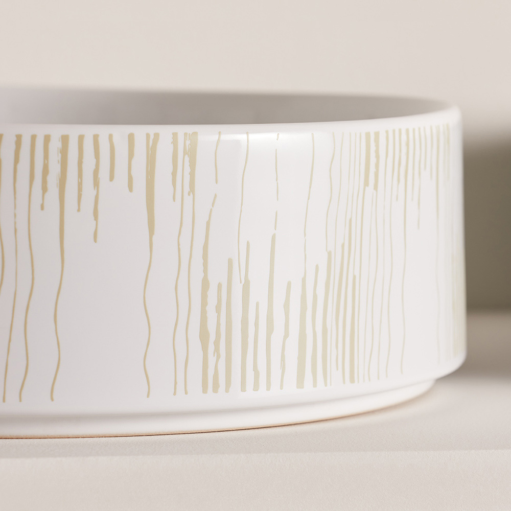 - glossy white interior, exterior cream drop relief decoration on matt white enamel