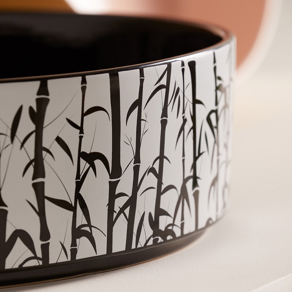 - glossy black interior, exterior white negative relief decoration on matt black enamel (black bamboo)