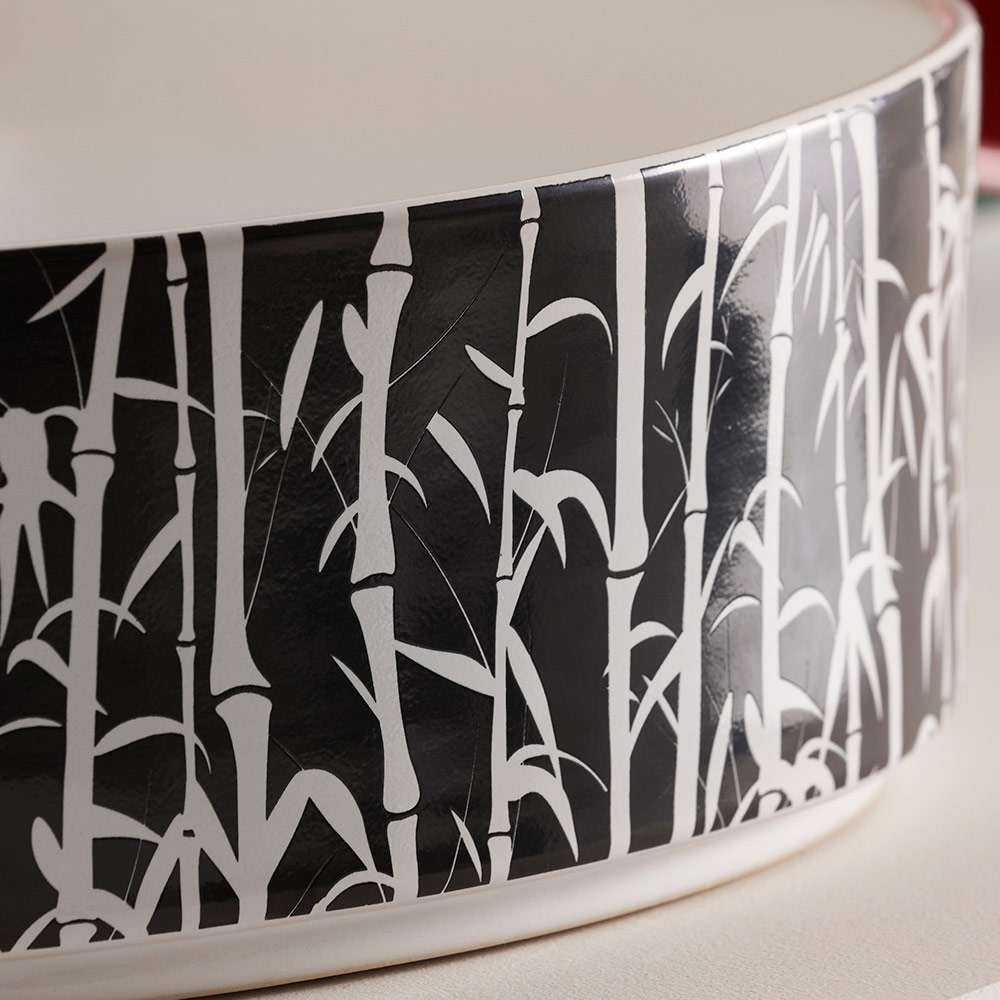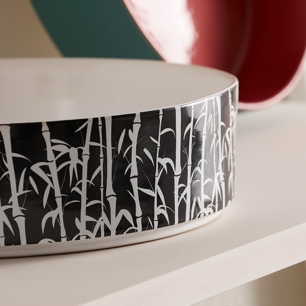 - glossy white interior, exterior black negative relief decoration on matt white enamel (white bamboo)