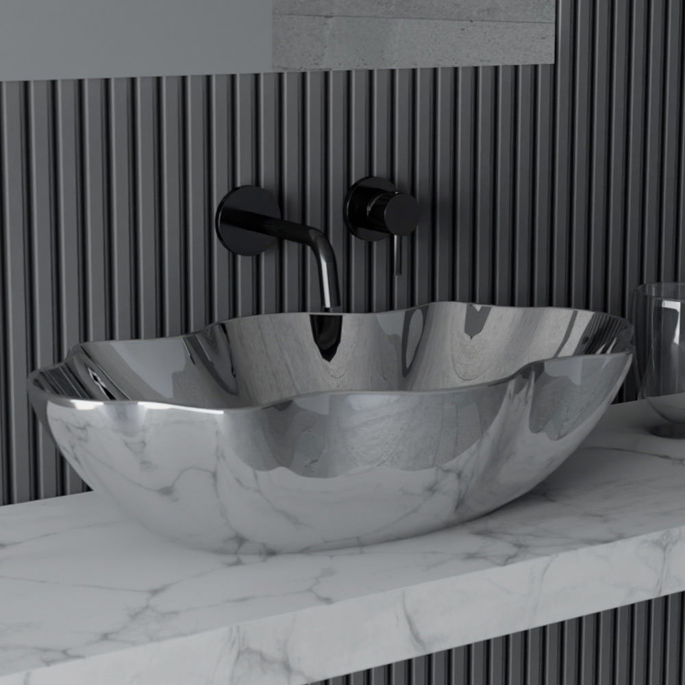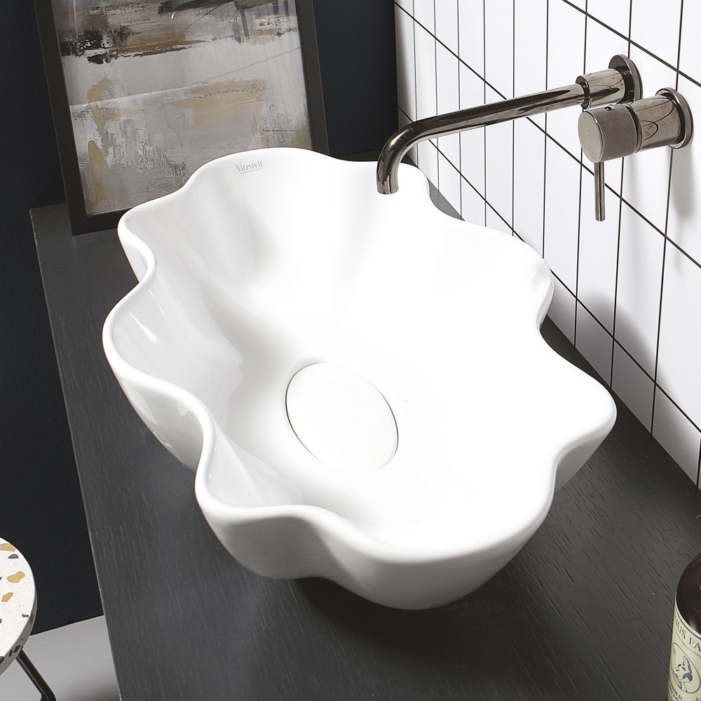 Countertop ceramic bathroom sink, made in Italy through artisanal production . A furnishing accessory for the bathroom area characterized by an original and captivating style whose idea comes from the desire to propose furnishing solutions that are distant from classic mass-produced products. The result is a washbasin with an exclusive aesthetic that attracts attention thanks to its imposing modern personality and the particular shape that recalls that of a shell.