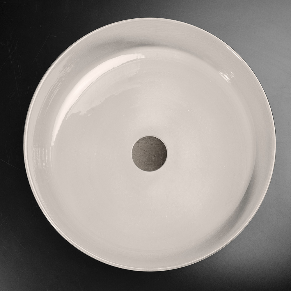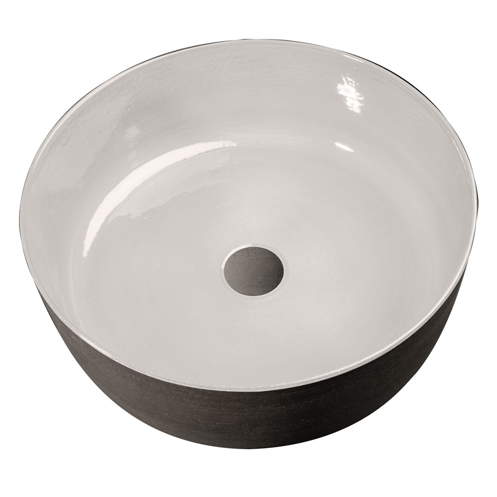 Round countertop washbasin made of hand-turned refractory clay with third fire cooking and 100% Made in Italy . Its aesthetic is characterized by the perfect combination of the natural waxed and waterproofed exterior with a more rustic style and the glossy and vitrified interior in white finish, the colour of freedom and peace that recalls the whiteness of snow and the brightness of nature. in its purest form. Each element of the washbasin is handcrafted to give life to an exclusive furnishing solution, of high value and of unparalleled quality.