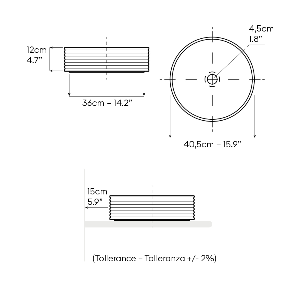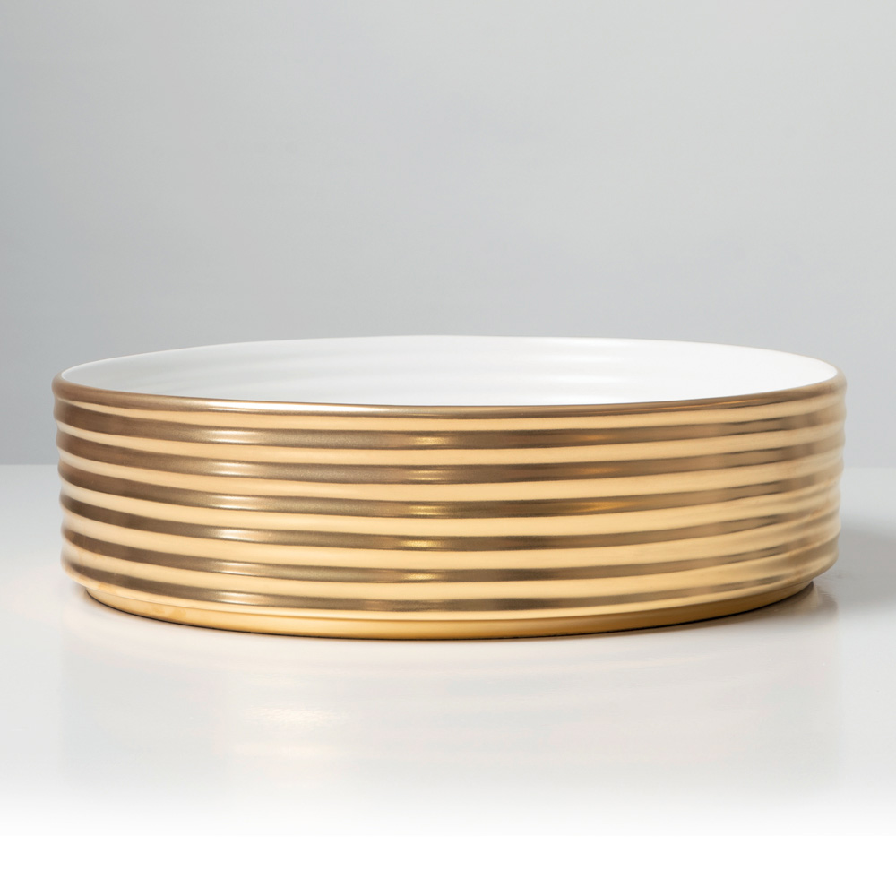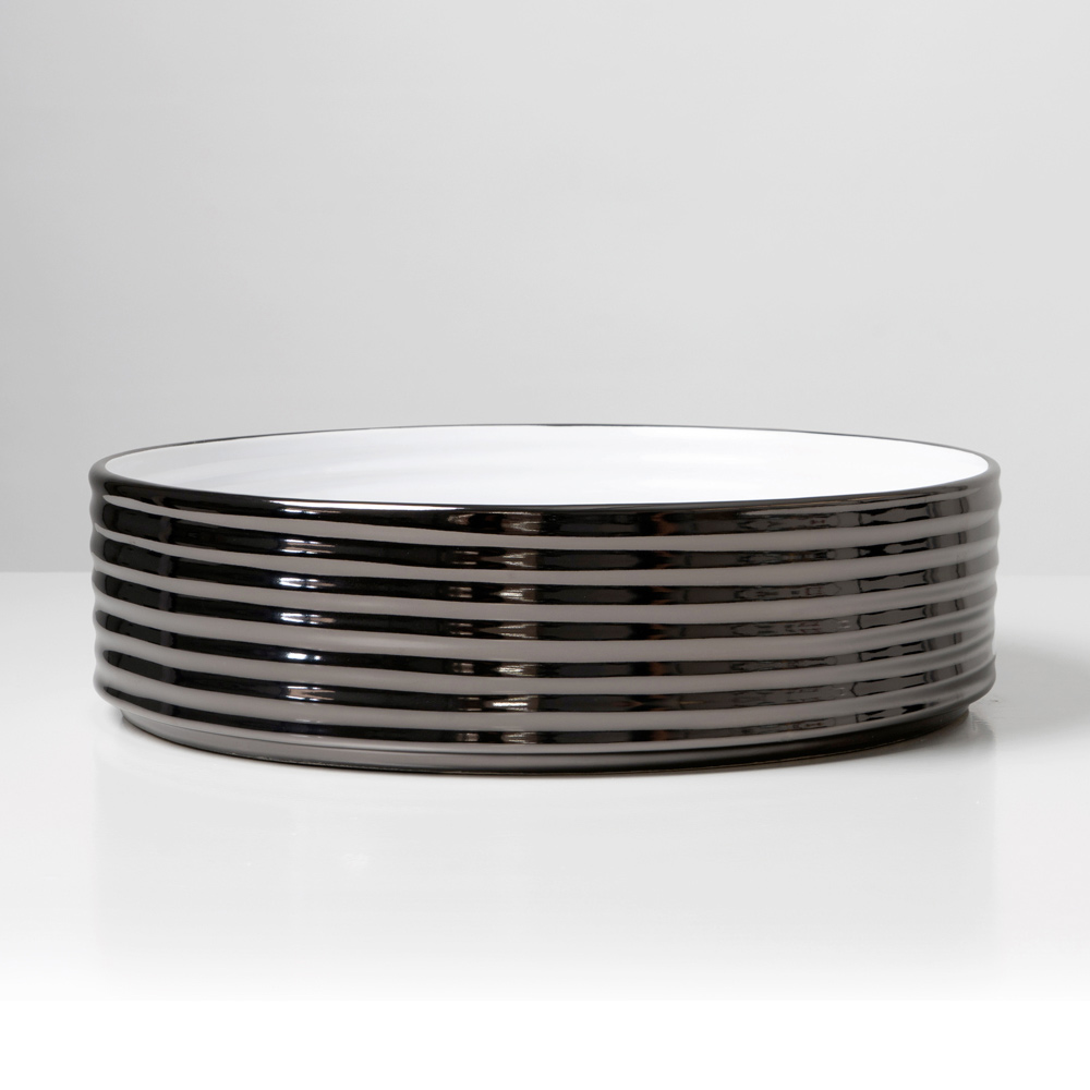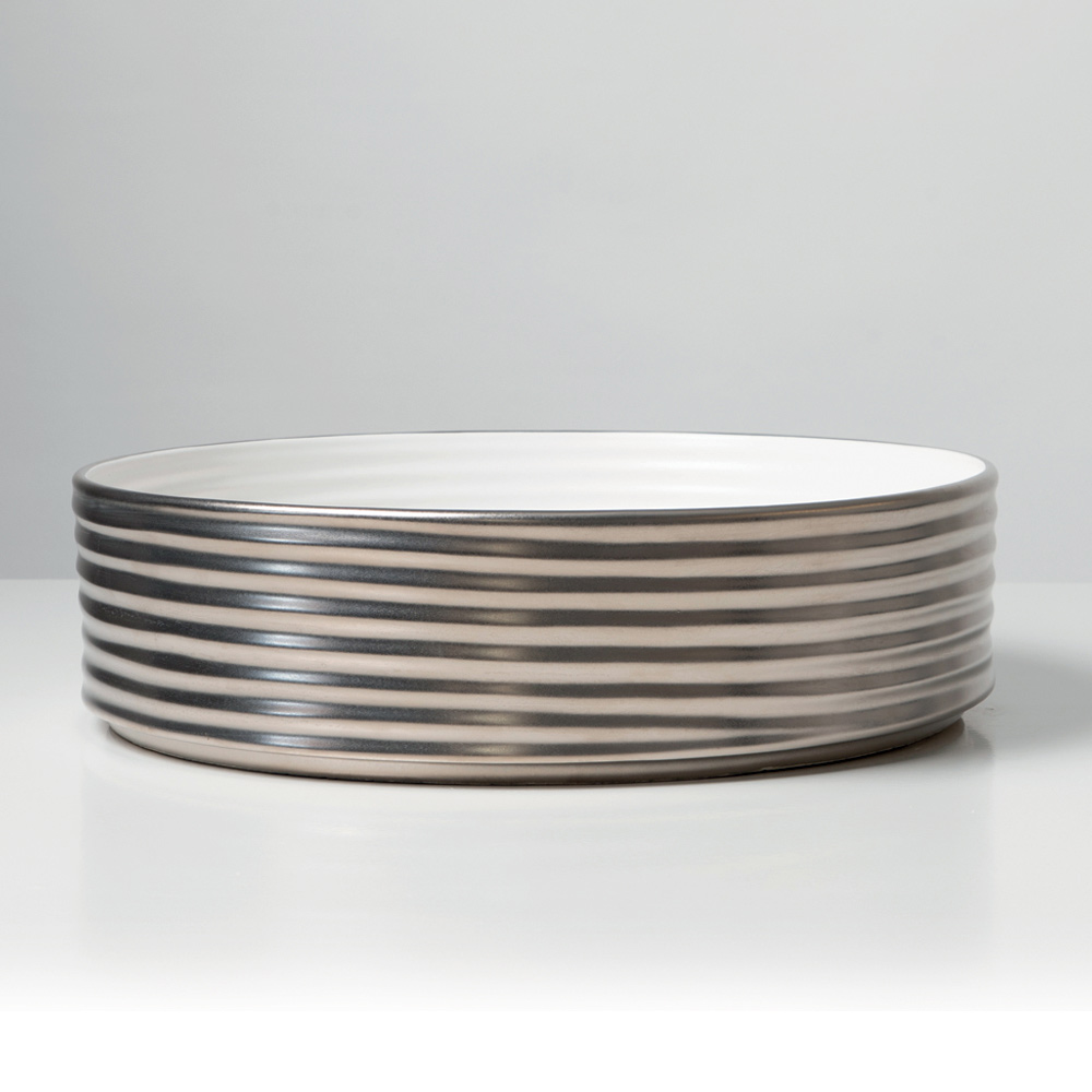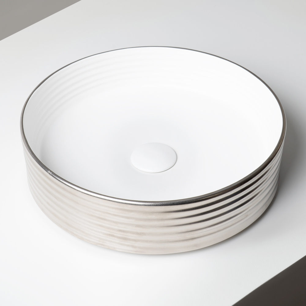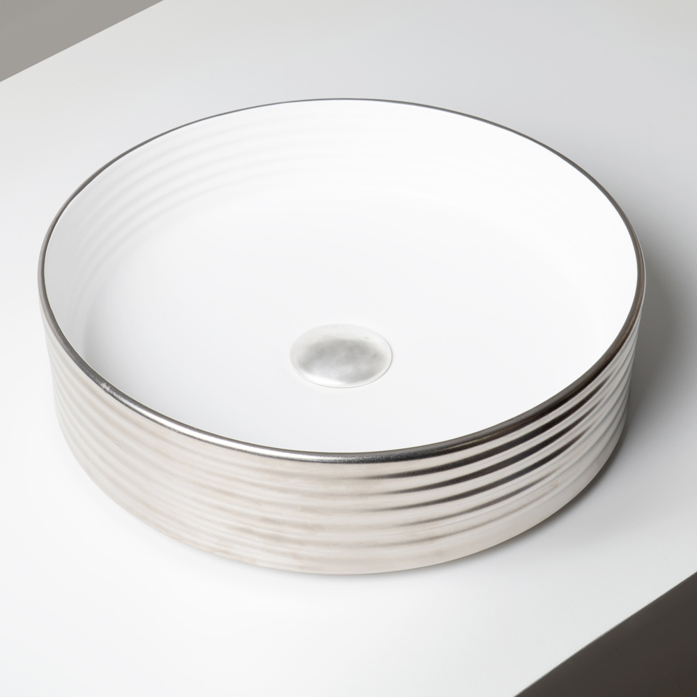 This porcelain stoneware countertop sink is hand-turned and stands out for its wavy surfaces with horizontal bands , capturing the light and transforming the material into a fluid, soft, and refined element. A design object that combines aesthetic research and artisanal mastery.