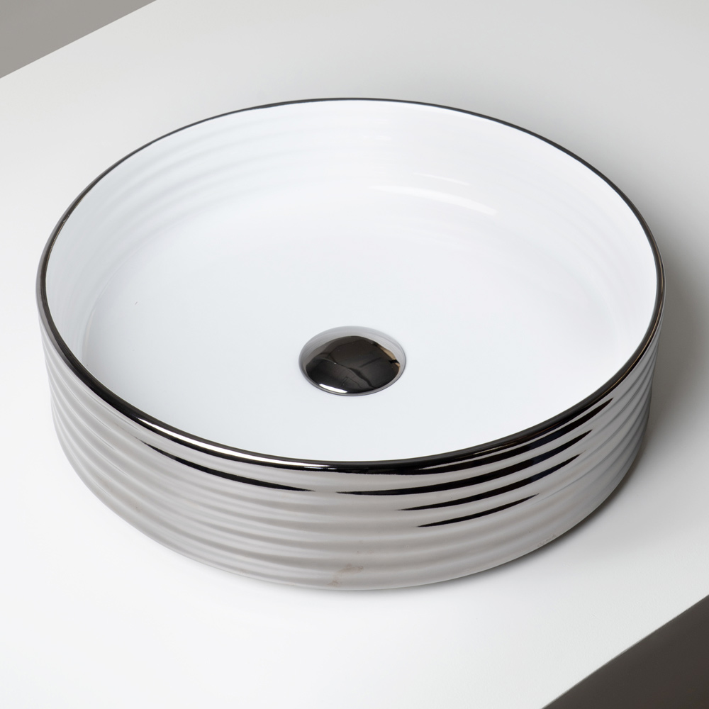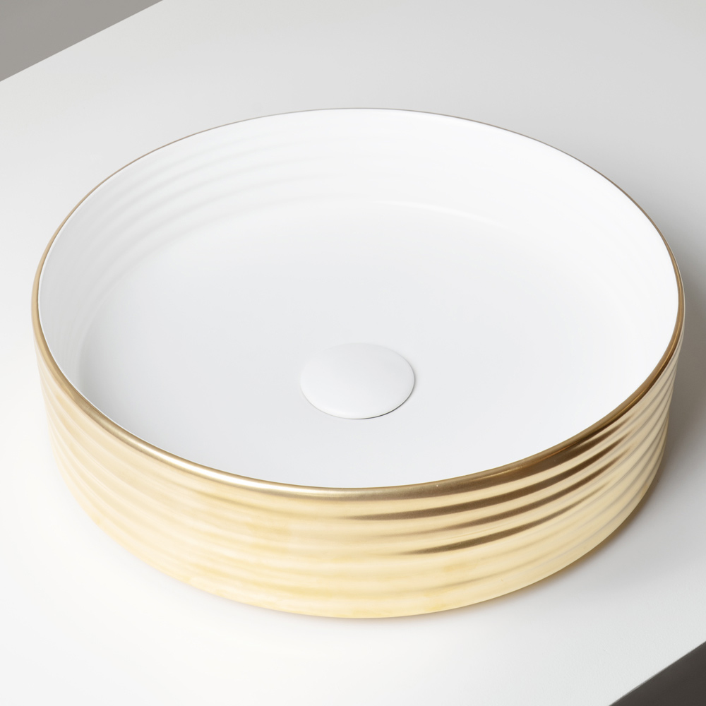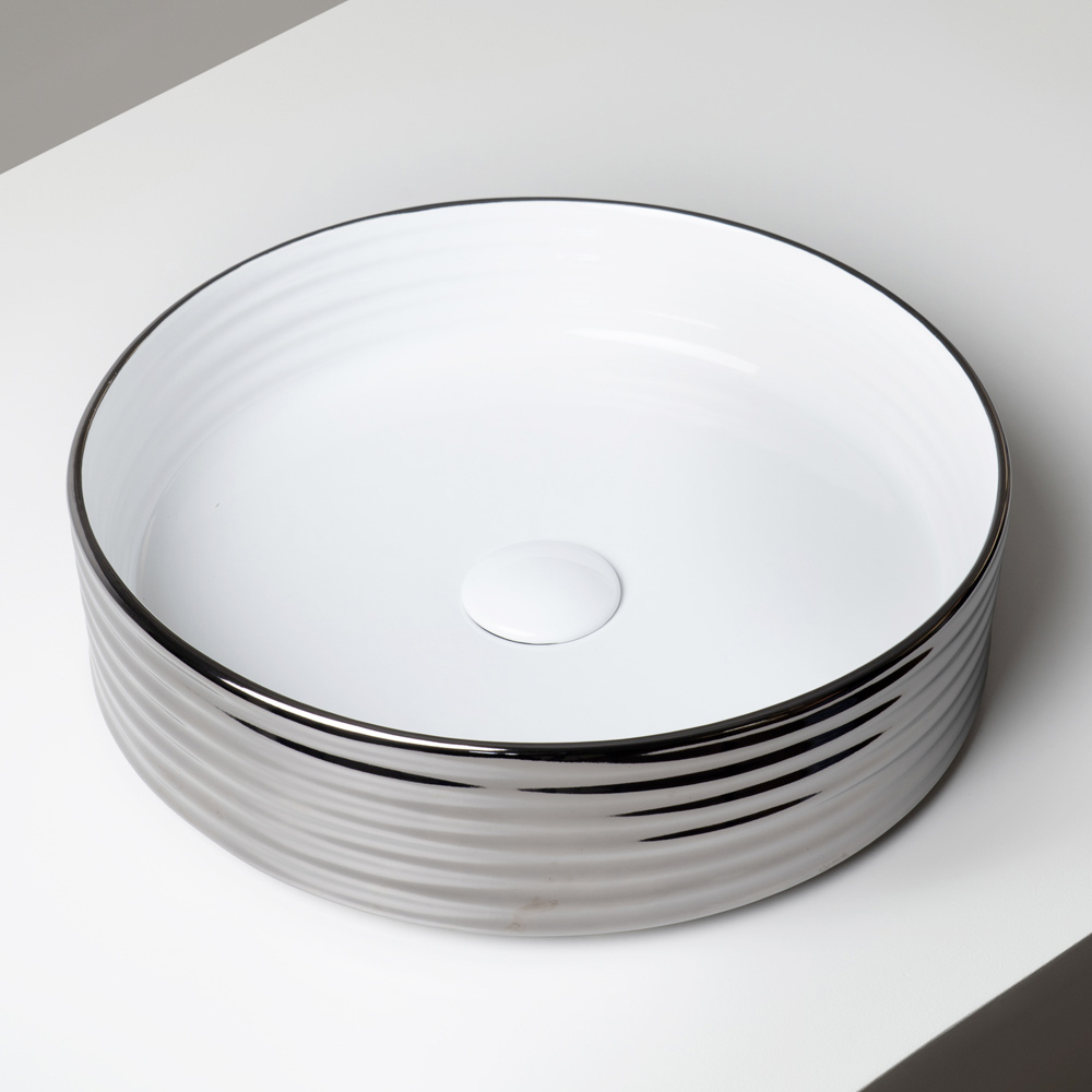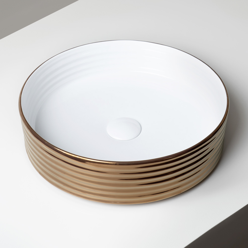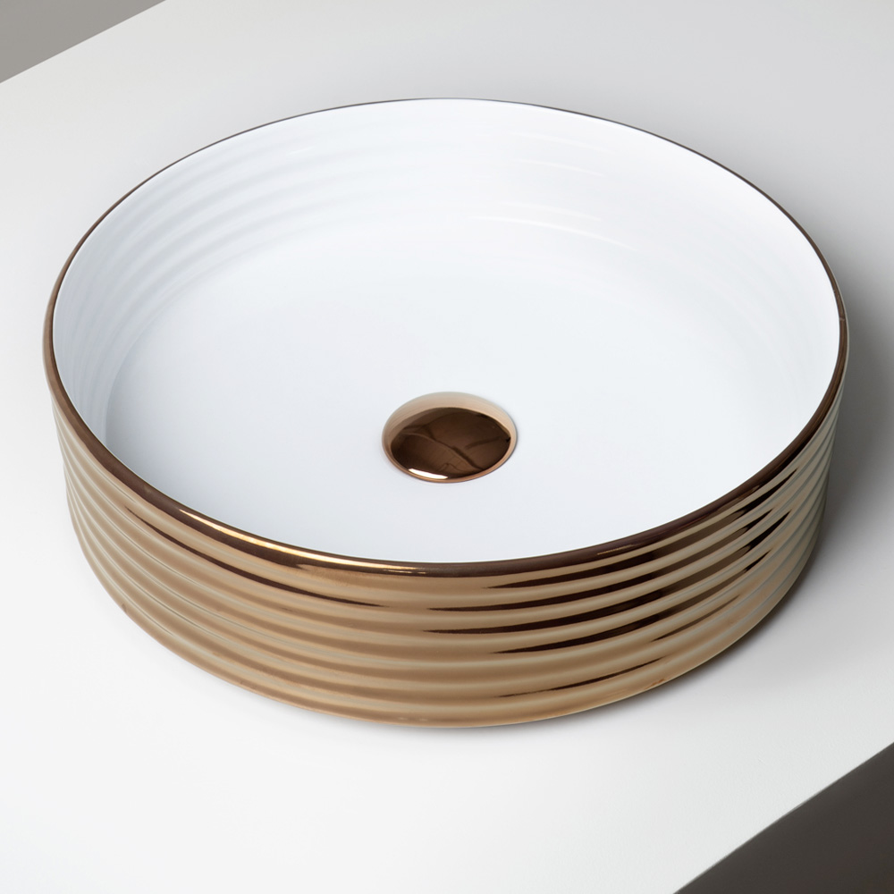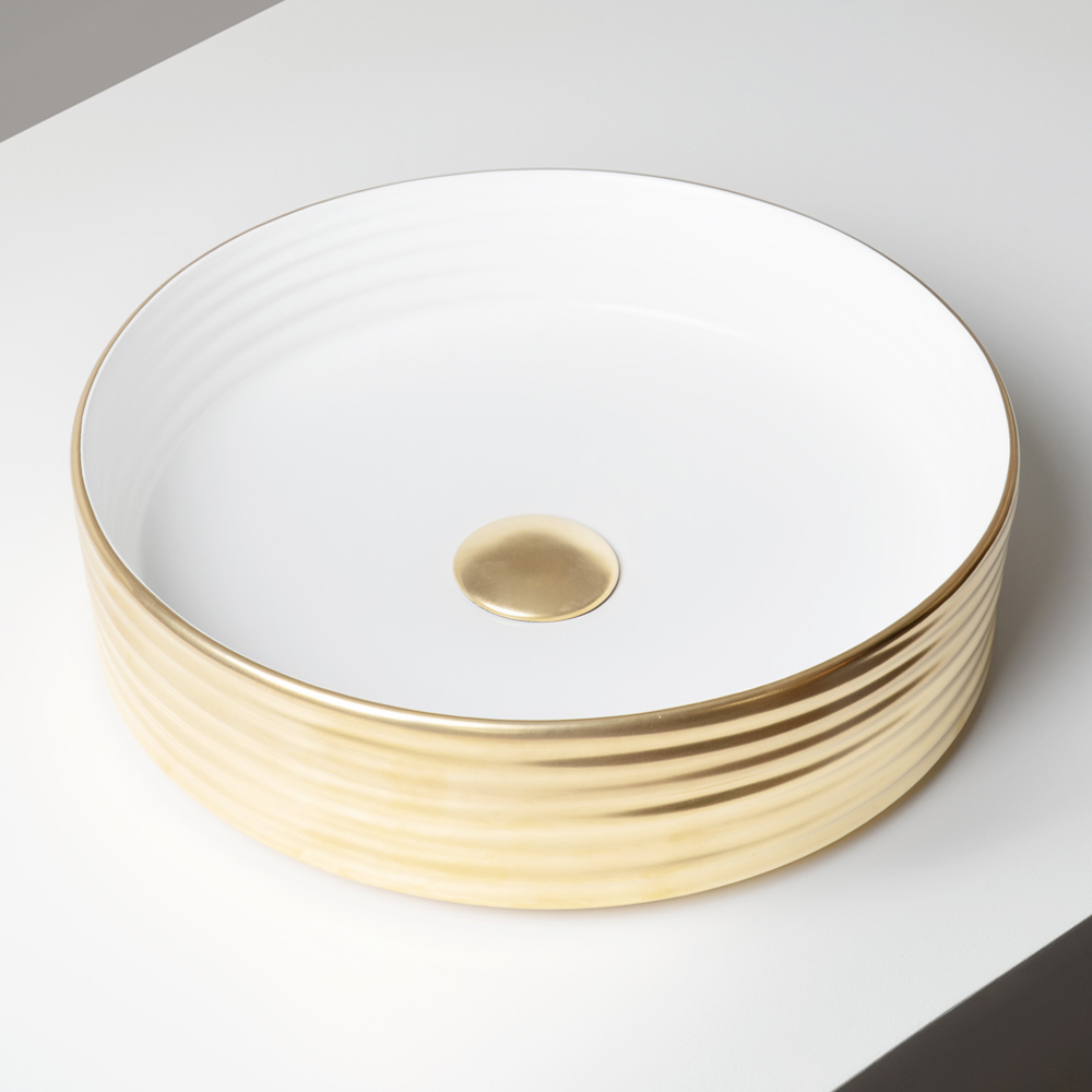 This washbasin is ideal for high-end bathrooms, prestigious residential and contract projects, where design takes center stage through refined materials and luminous finishes.