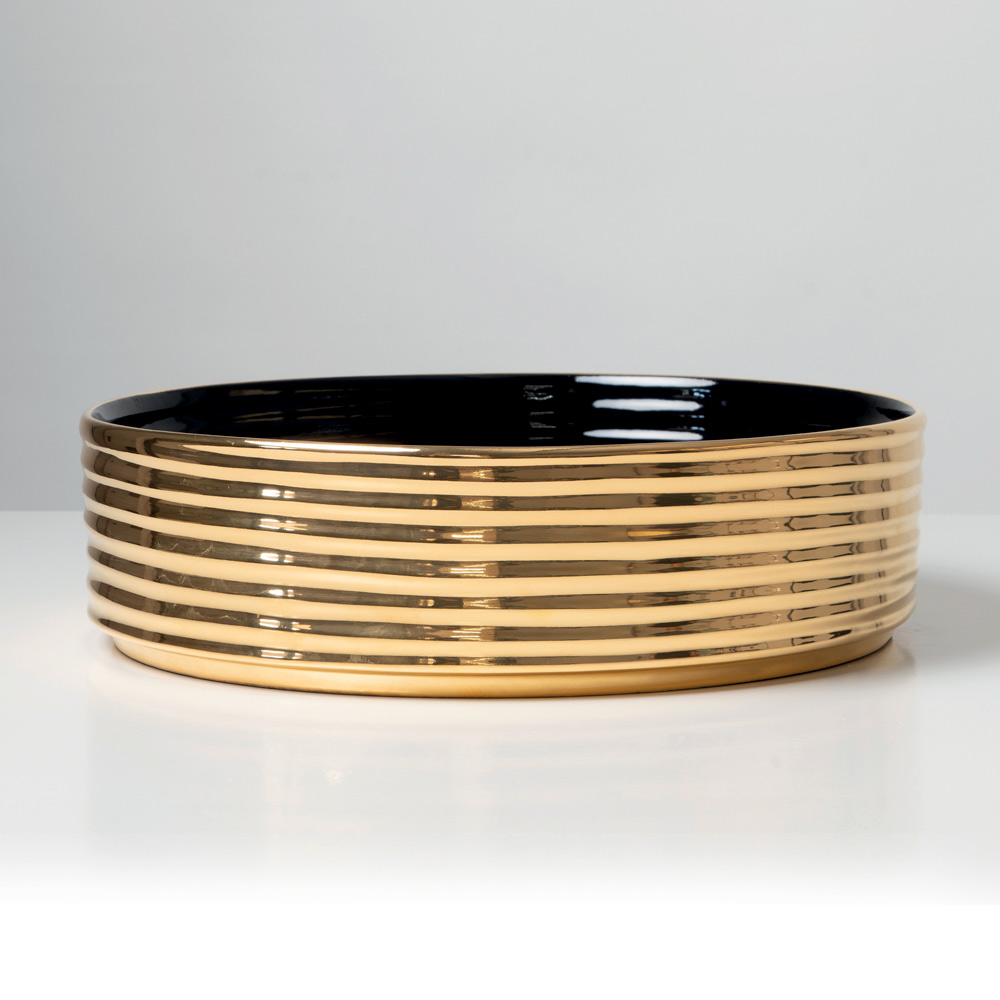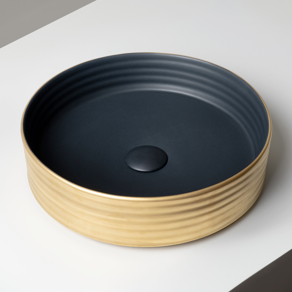 The contrast between the enameled interior and the external finishes gives the sink a refined and contemporary feel, making it a true gem for the bathroom. The elegant and sophisticated color palette enhances the volume with iridescent reflections and textured depth.