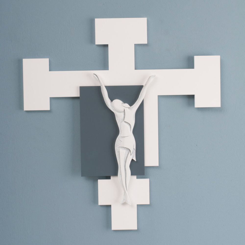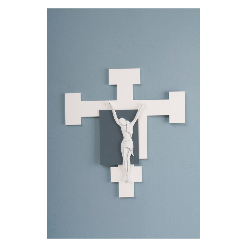 Crucifix in white lacquered wood with application of detail in blue and white lacquered Christ with light engravings of the details of the body.