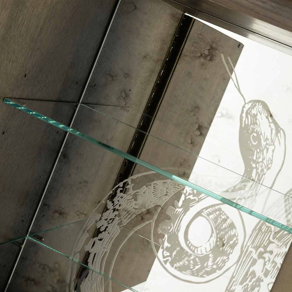 Joy is made of solid oak wood with metal legs in patinated brass finish and adjustable feet. The two doors are covered in Elite aniline leather, while on the inside there are two glass shelves.
