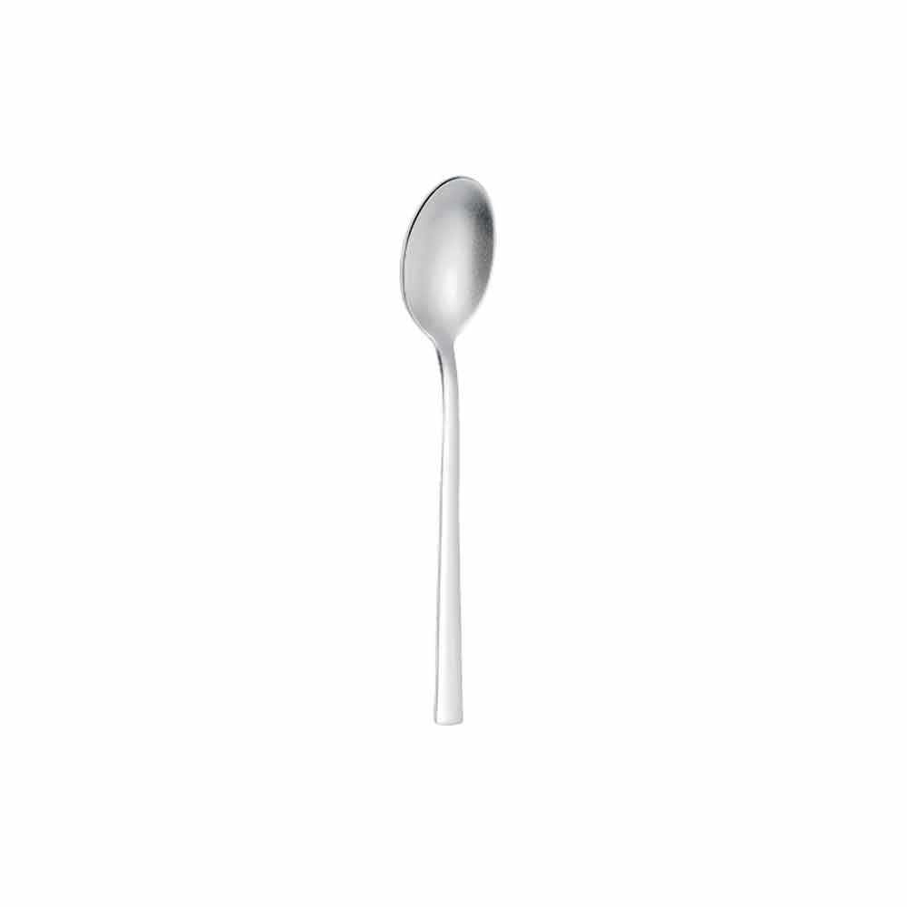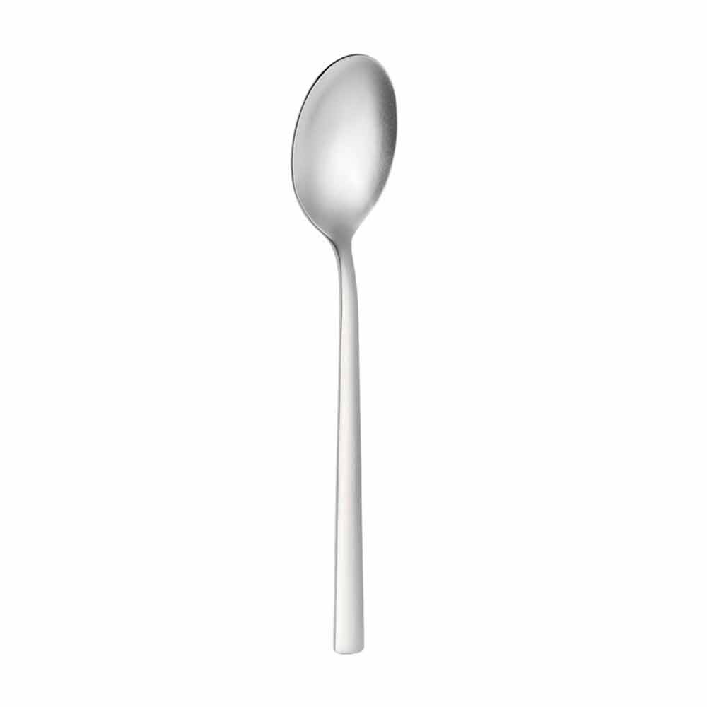The design is characterized by an elegant , refined and trendy style: the linear handles are characterized by their pure and simple silhouette. The monobloc knife has a sinuous and ergonomic handle , while the bowl of the spoon differs for its slightly squared shape , a peculiar detail of the service.
