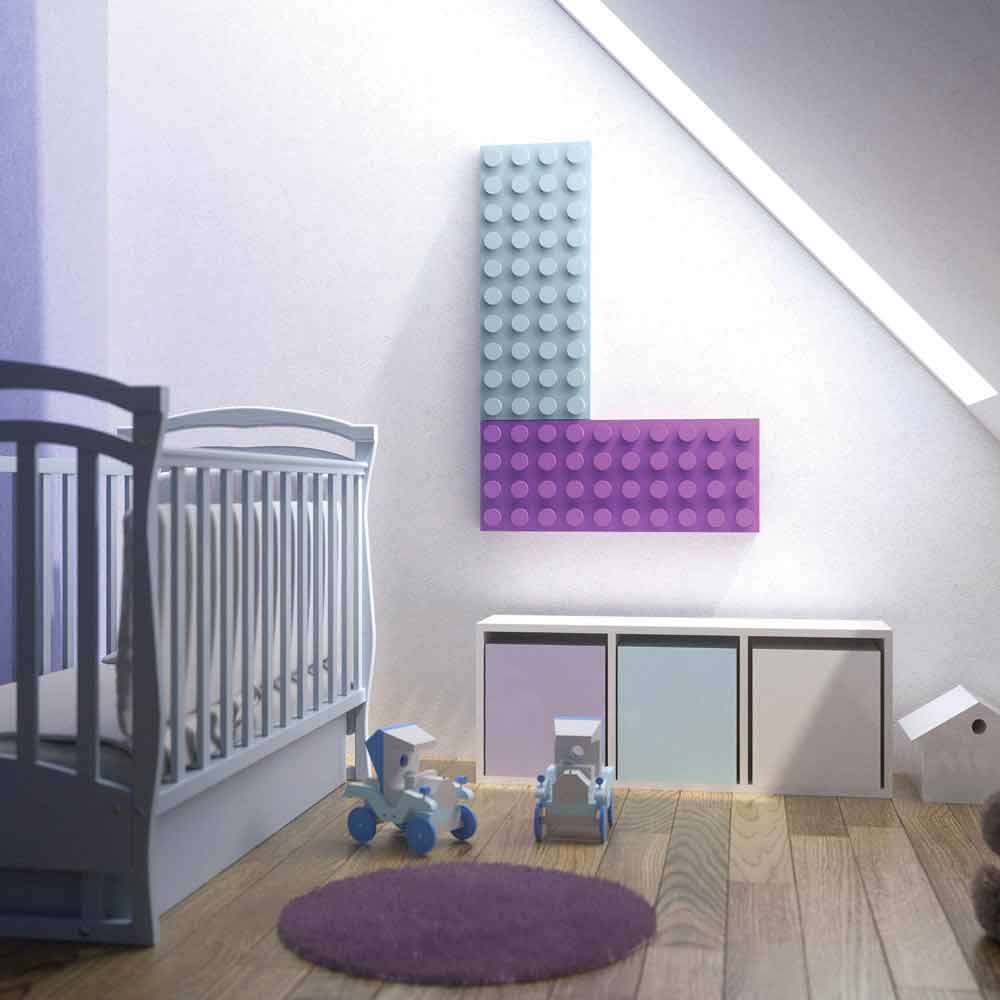Colorful radiator with a modern and fun style, in the hydraulic version. A project inspired by an affective icon shared by all. Multiple colour combinations for horizontal and vertical modular elements. As in a construction game, the elements combine, placing themselves side by side depending on the available space and the necessary thermal output.