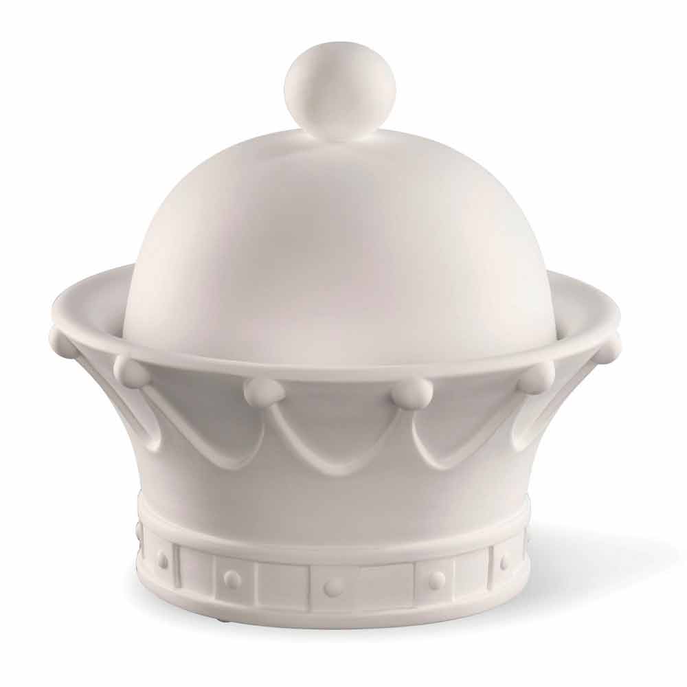 Decorative ornament in the shape of an opening queen's crown handmade in Italy in white ceramic . An eccentric and elegant ornament at the same time capable of completing the surrounding furnishings by creating a wonderful harmony that embodies modernity and design . Its original and creative shape is ideal for those who love to enrich their domestic spaces with elements characterized by an original and unique soul while offering a small space in which to cram and organise some objects thanks to the practical compartment positioned under the lid.