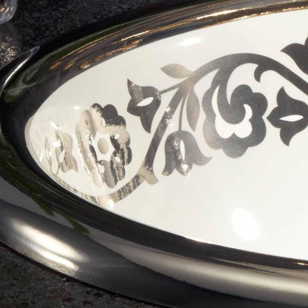 Built-in bathroom sink made in Italy in hand-worked fire clay decorated with platinum gold flower band and platinum hand-painted edge.