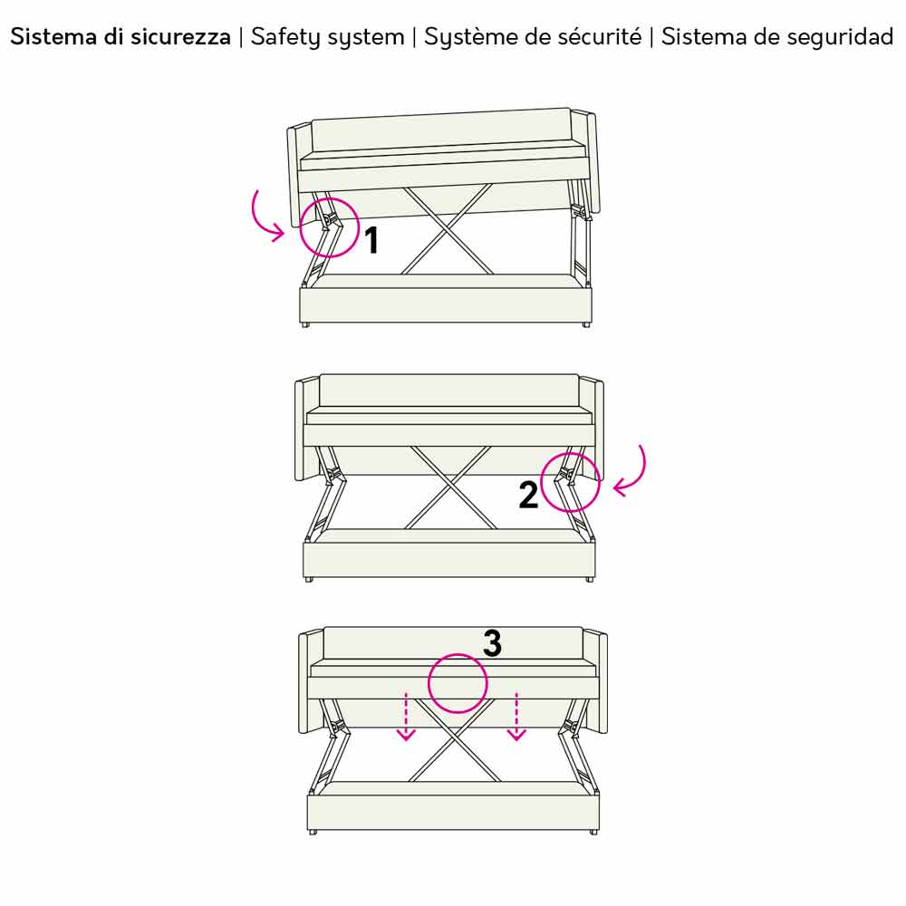 easy and fast opening mechanism equipped with 3 safety levels while to close it it will be sufficient to release the two side supports, which will remain blocked until the central stop is also released. The sofa bed is also equipped with a practical ladder and side rail for an even greater guarantee of safety.