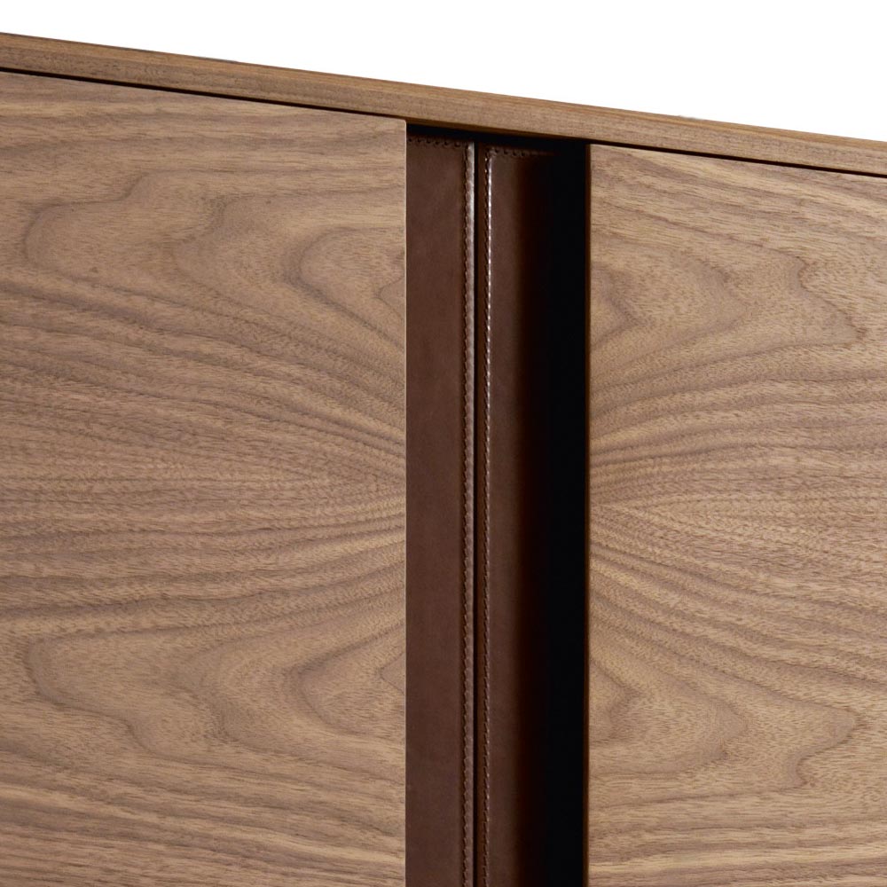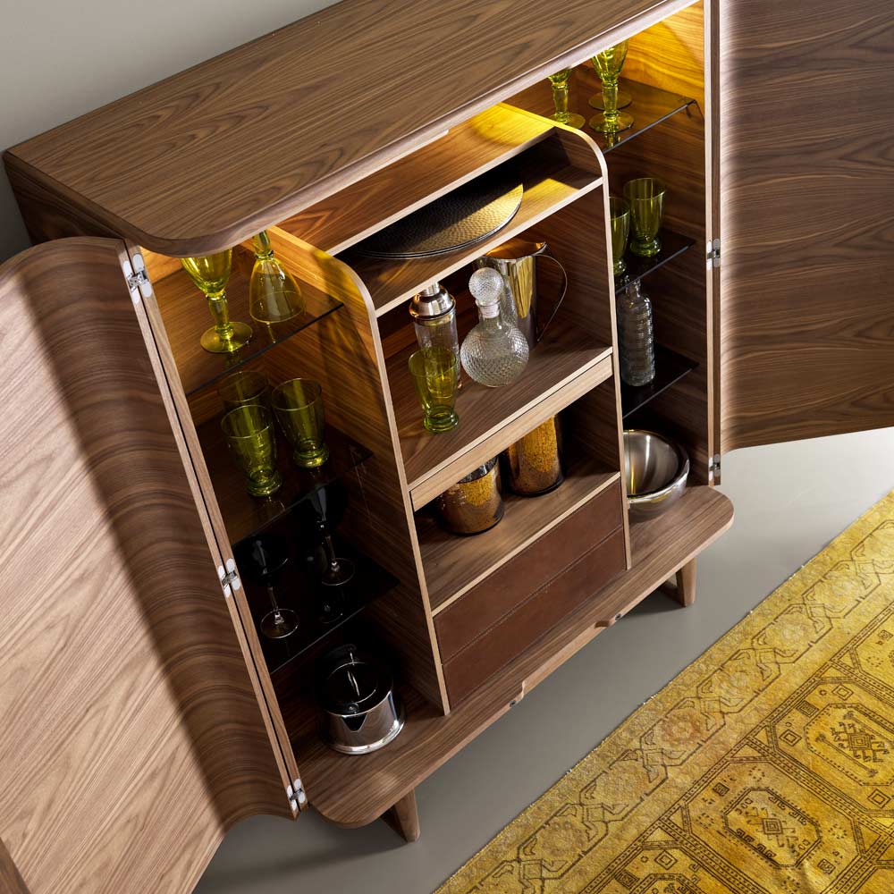 Inside the cabinet you will find smoked glass shelves, pull-out service and drawers, equipped with hidden sliding guides with the silent system; the front and the bottom of the drawers are covered in natural leather.