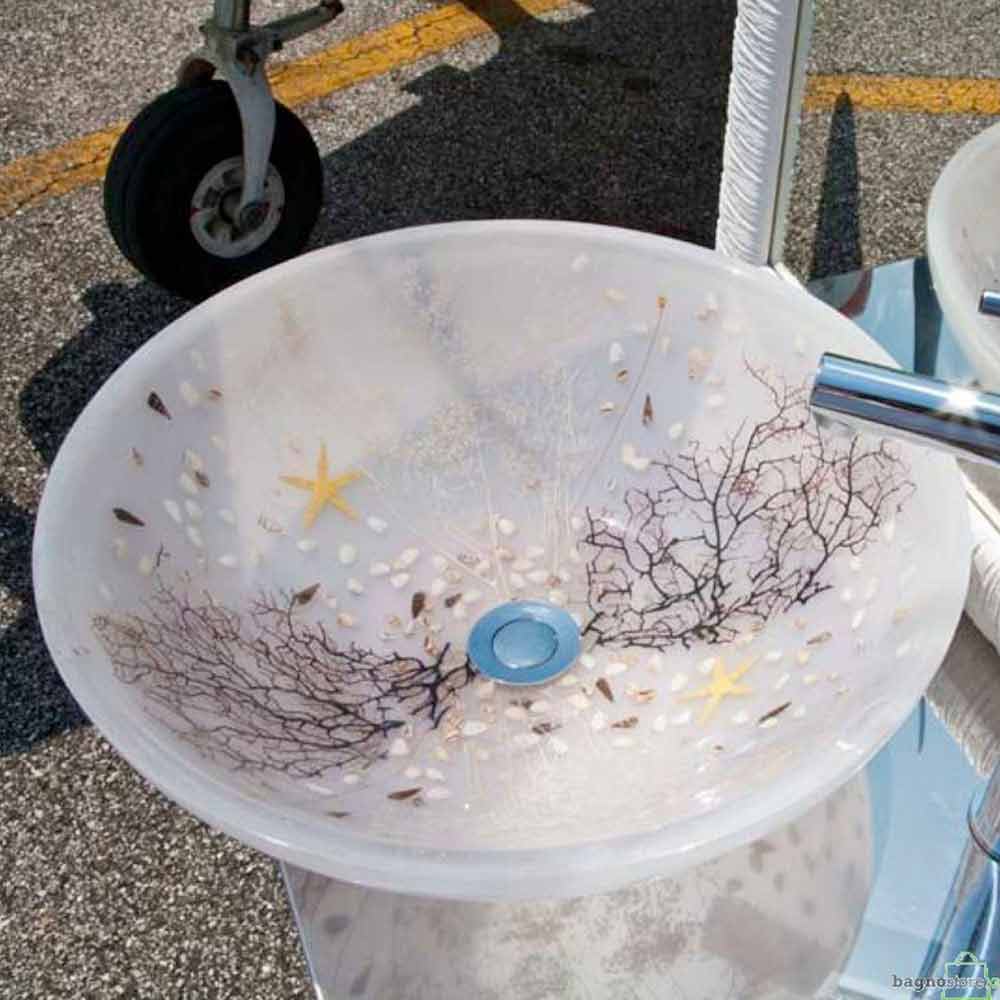 Washbasin made of transparent opal resin with inclusions of corals, shells and starfish.