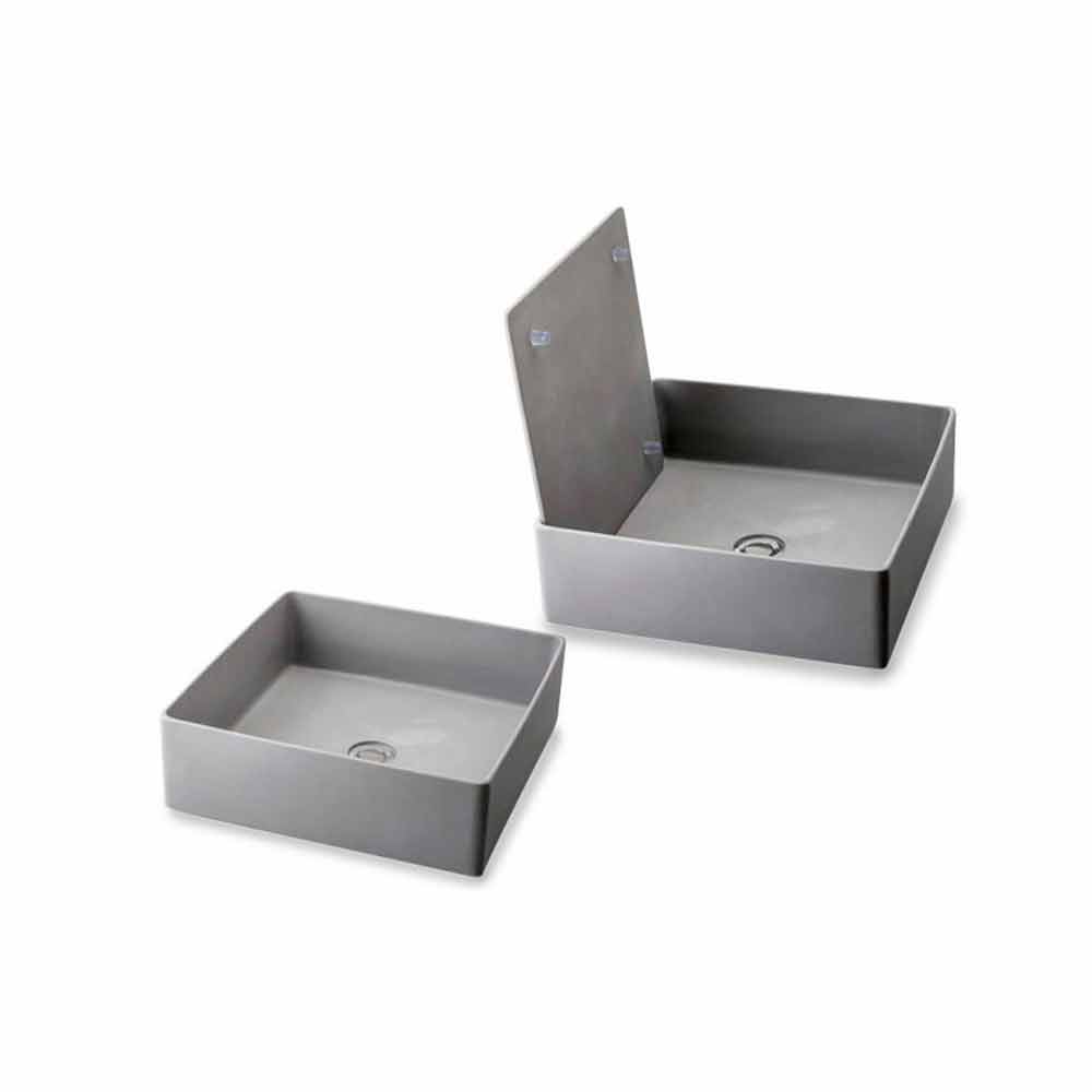 This sink knows how to change clothes when needed! This countertop sink in grey resin is equipped with a removable internal tray which, allowing the water to drain from the edges, covers and hides the central drain. Countertop sink in grey resin with internal plate covering the central drain. Plate available in: resin, wood and steel.
