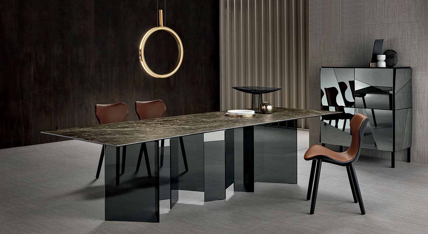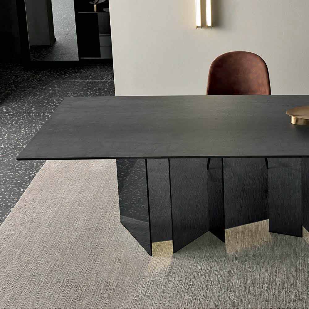Modern kitchen table with ceramic top and smoked glass base, made in Italy.
