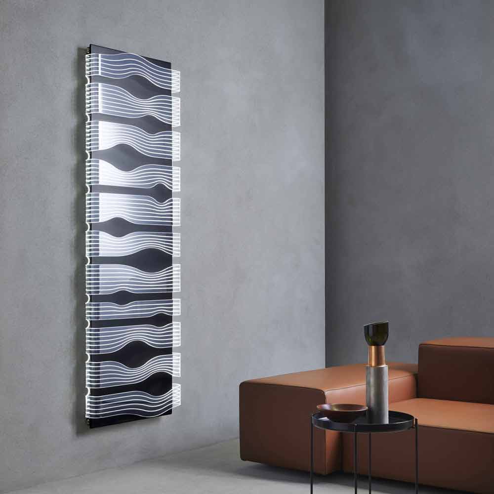 Modern vertical design electric radiator with LEDs for lounge or bathroom, made in Italy.
