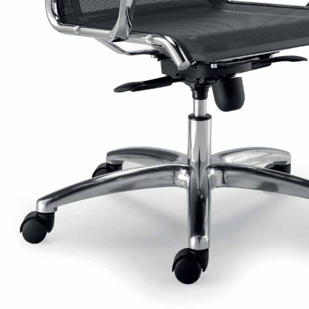 Characterised by an oscillating mechanism with advanced bi-lever fulcrum in pressed steel, complete with 4 locking positions, anti-shock backrest safety system and adjustment of the spring tension for the calibration of the swing by means of a knob. In addition, its beauty increases with the chrome-plated aluminium armrests and the 5-star base in polished aluminium, complete with Ø 50 mm braked wheels.