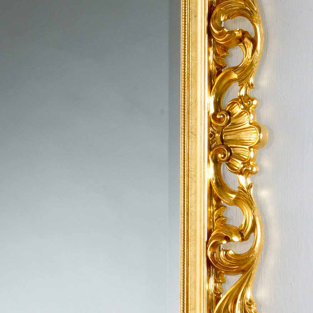 The Mata mirror is characterized by a craftsmanship carried out using quality materials and using the experience of skilled Italian artisans. The frame is made of wood decorated with carvings. Gold leaf finish. 4mm thick beveled crystal mirror. Made in Italy.