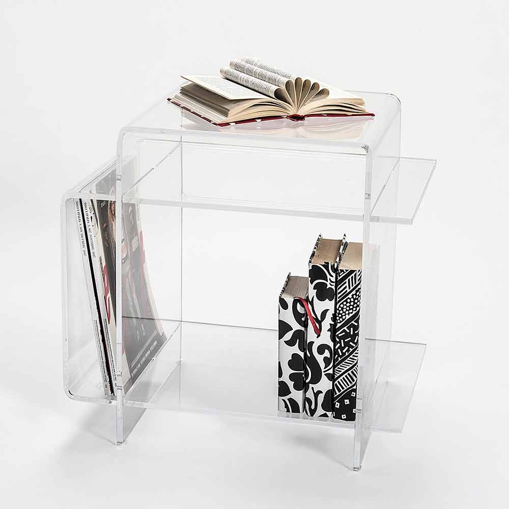 Versatile 3-shelves side table / bedside table, inspired by the geometry of the 1970s, made of 100% virgin polymer transparent plexiglass, laser cut and folded at high temperatures.