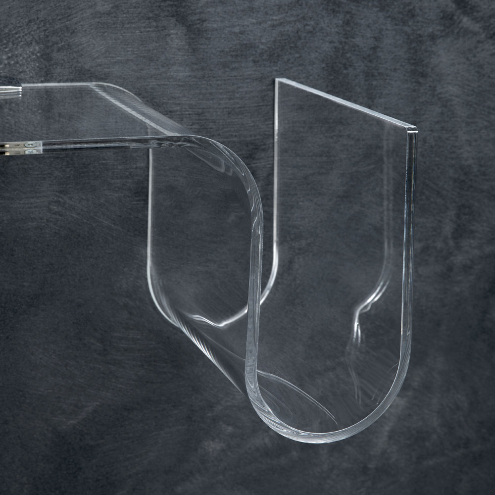 It is characterized by the curved side queue ideal as a magazine rack. Thanks to the transparency and brilliance of the material, the piece of furniture seems to float suspended in the air.