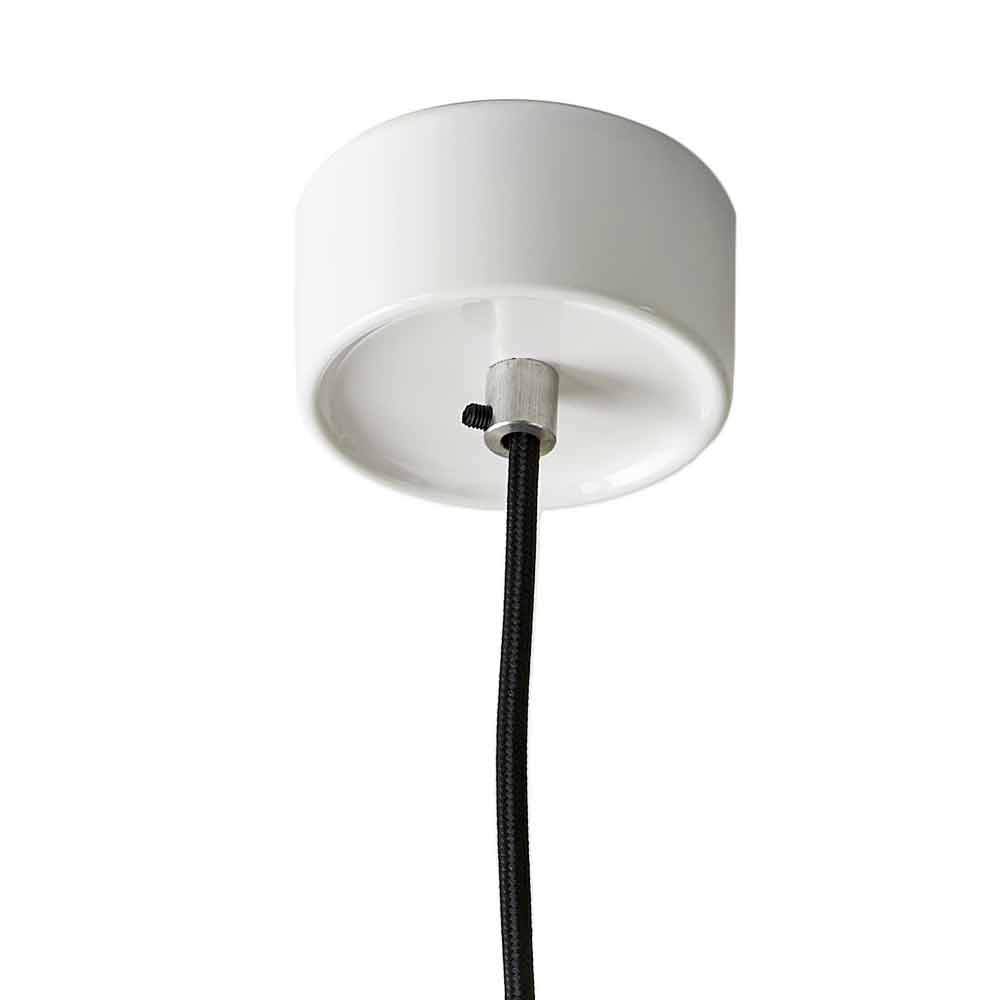 The fairy-tale Asia suspension lamp was made of ceramic in white and grey; the great touch of class is given by its black canvas cable and its aluminium cable clamp.