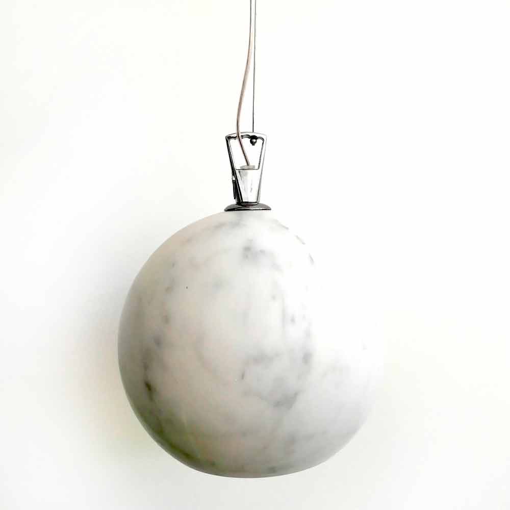 Wonderful suspension lamp characterized by the particular spherical shape and simple lines but with a strong visual impact. Ideal for combining functionality and design in a single product that can complete the furnishing of modern environments. This item is handmade in Italy by expert artisans who, thanks to the techniques used and the raw materials chosen, contribute to creating a high quality final product with attention to detail with an original and captivating design. Its structure is made of Carrara marble which is composed of a white background with fine-grained grey veins and has an internal LED light able to shine through the marble surface that allows you to create a unique and cosy inside any room in the house.