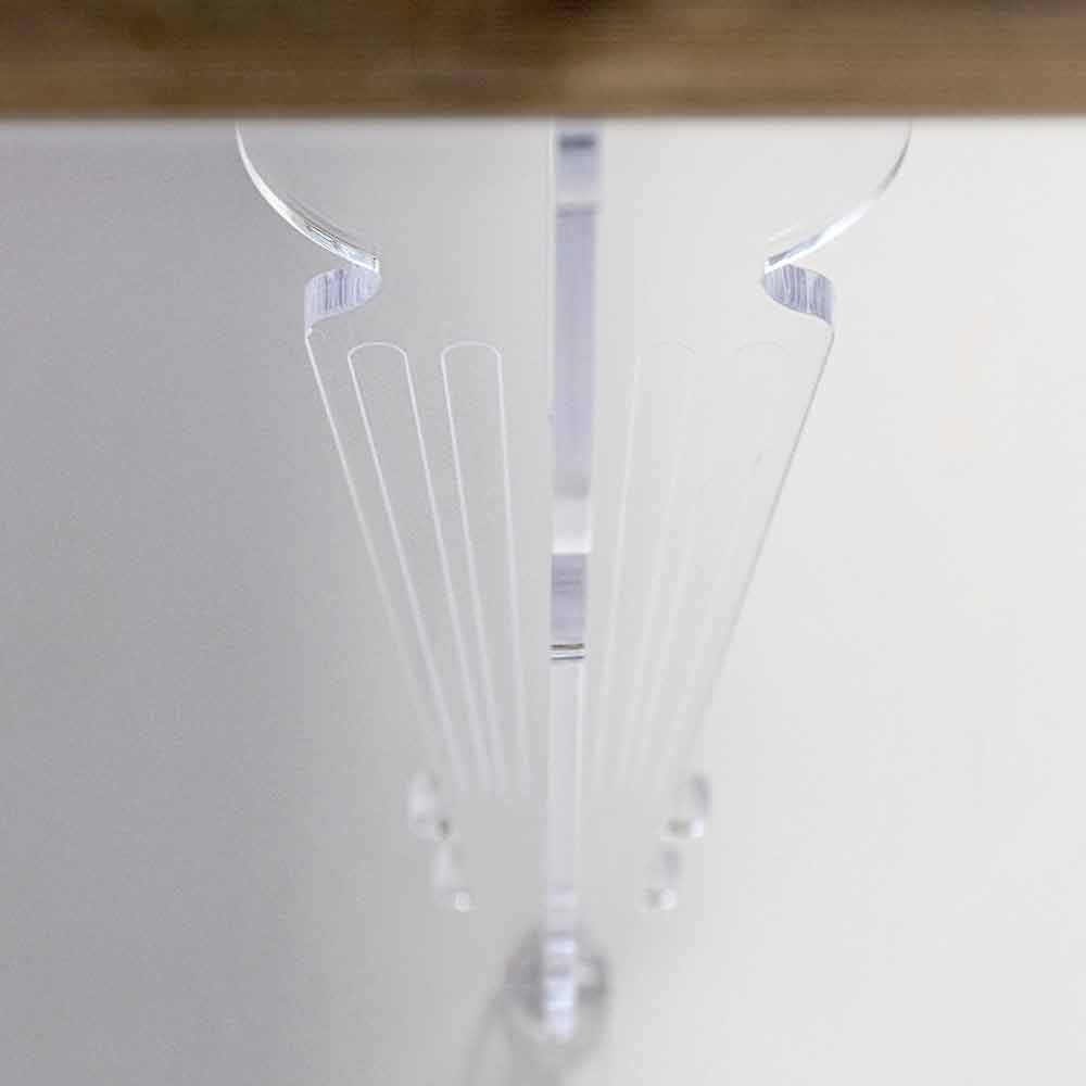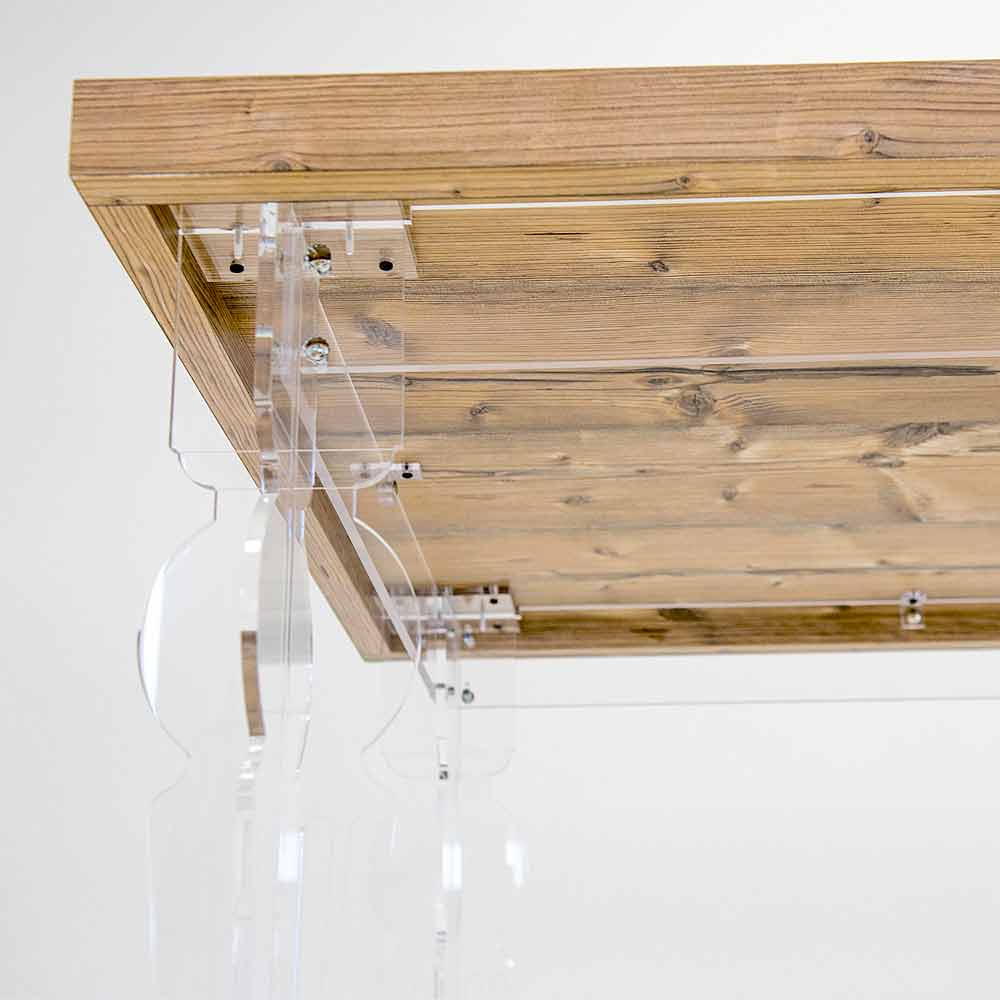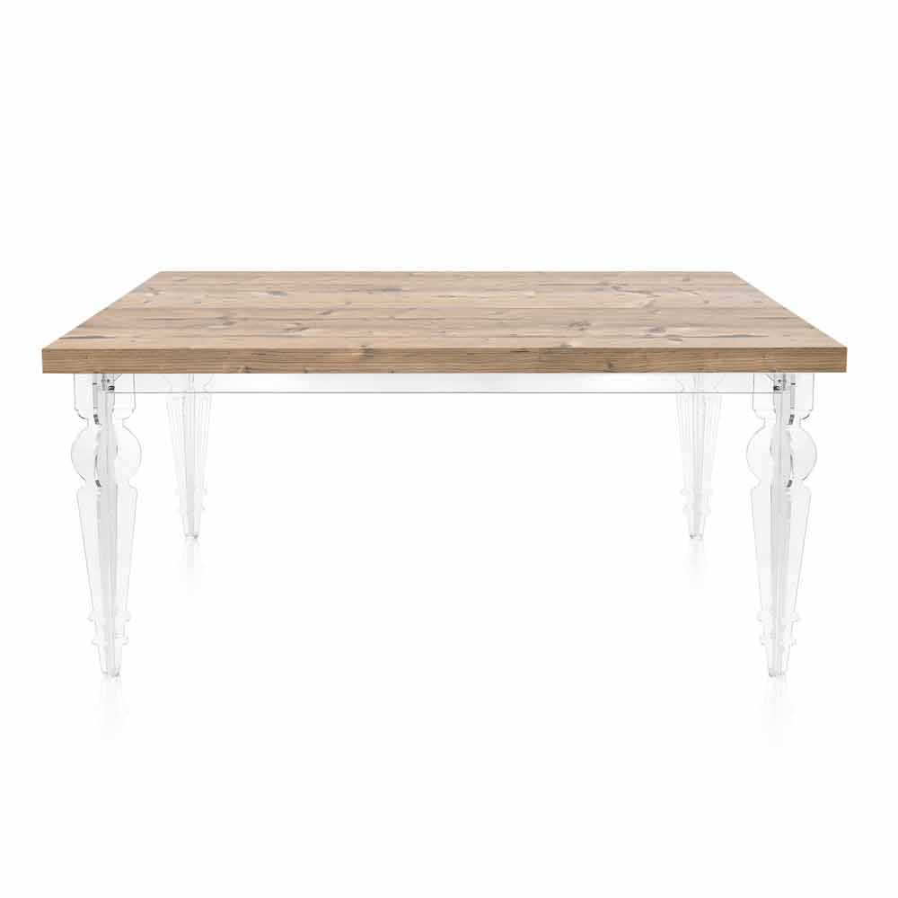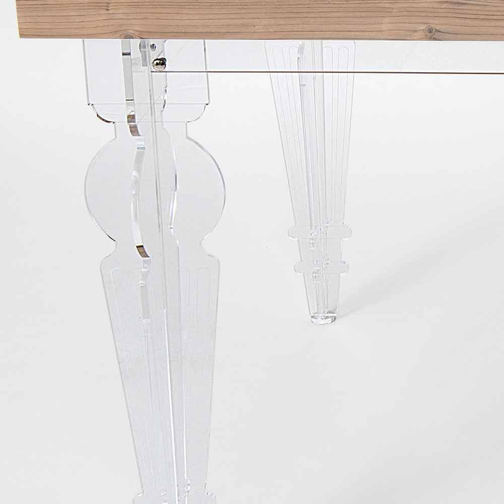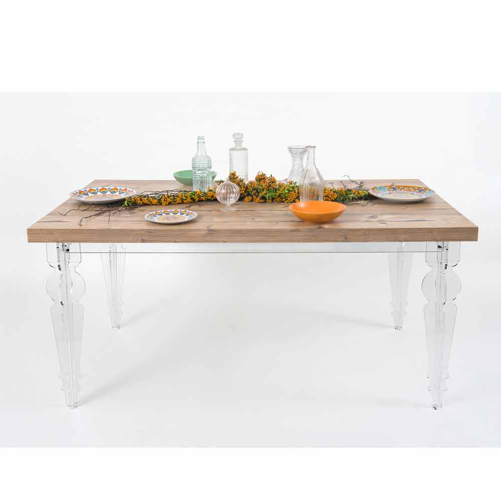 Castro is the perfect result of the combination of two excellent materials: legs in pure acrylic crystal PMMA and top in dark spruce wood with a matt natural brushed finish.