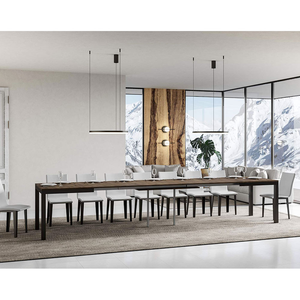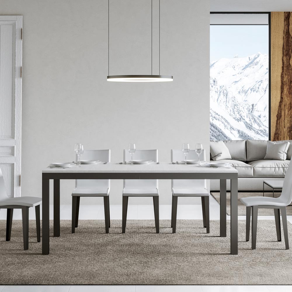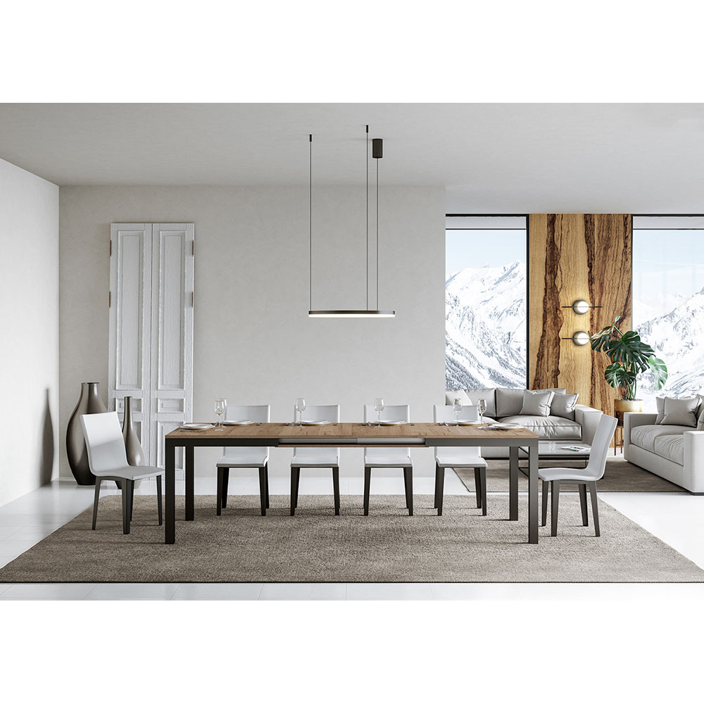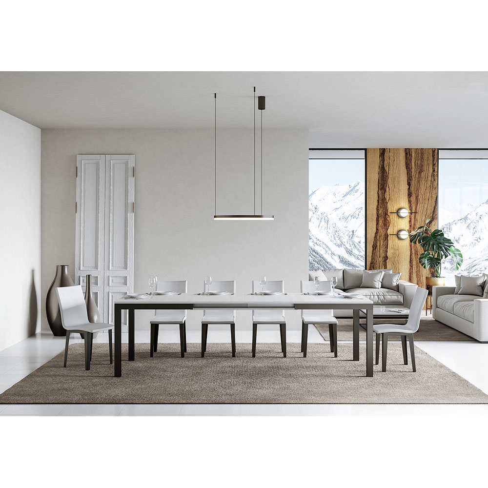 This extendable table ĆØ a perfect synthesis of discreet elegance and modern functionality. The tabletop invites people to gather around to share meals and precious moments, radiating a sense of welcome and warmth. The legs stand sturdy, ensuring stability and adding a touch of contemporary contrast.