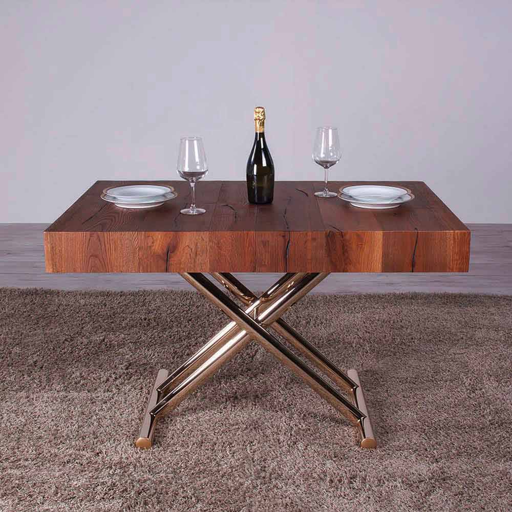Modern coffee table convertible into a dining table with wooden top and metal base Made in Italy.