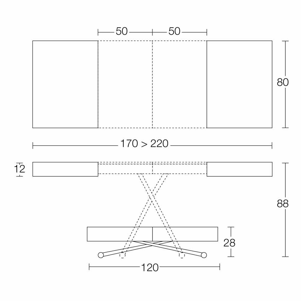 The top is rectangular and extendable through 2 internal extensions of 50 cm each.