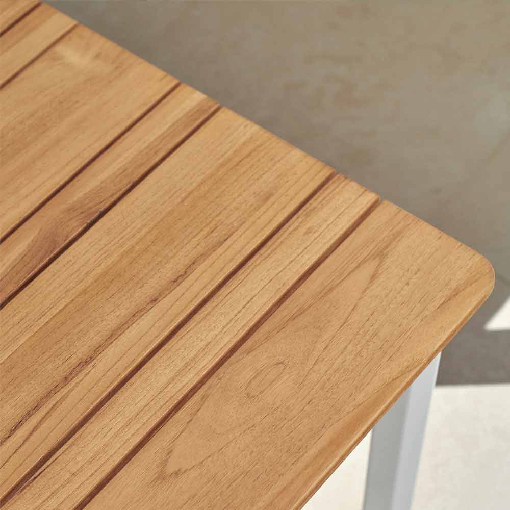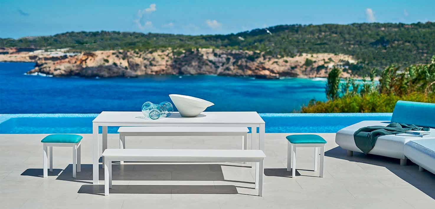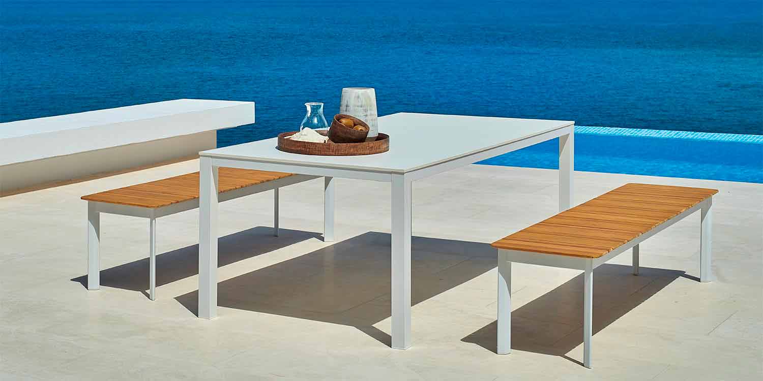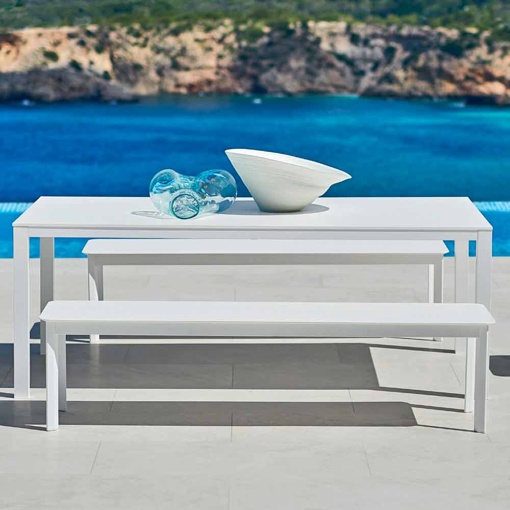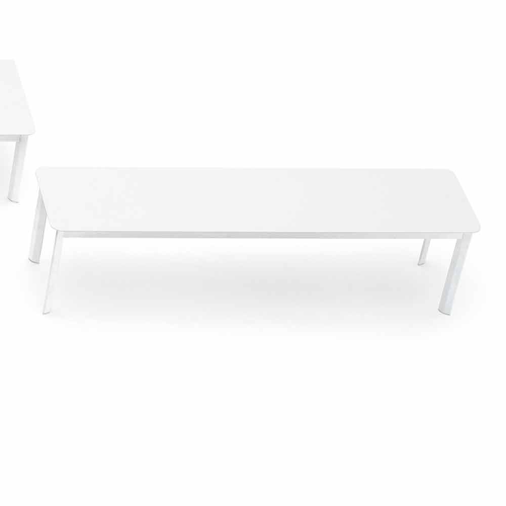 System is a fantastic garden bench with a white powder-coated aluminium structure; with seat top in HPL (sp 1.2) in finish: silk grey black border, white black border, anthracite black border, white white border, cement brown border, bedonia brown border, corten brown border; or with a bush-hammered ceramic top (sp 1.2) in a finish: white lime and grey porphyry; or in teak (sp 1.7) from certified plantation.