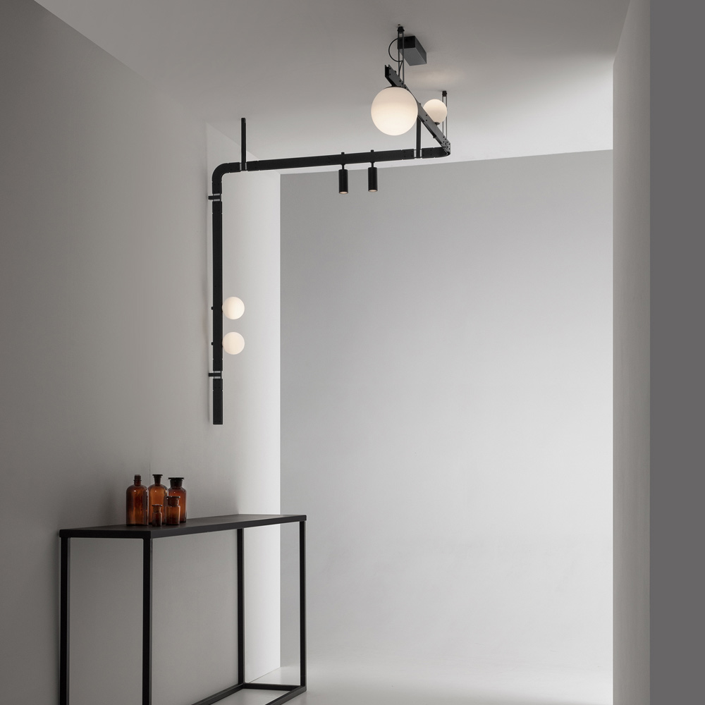The bearing bar recalls the engineering structures of the past and the electrified modular structures support lighting bodies ( white satin blown glass spheres and spotlights ) that can be placed in quantity and free arrangement, without the use of electrical power cables, for maximum freedom of expression.