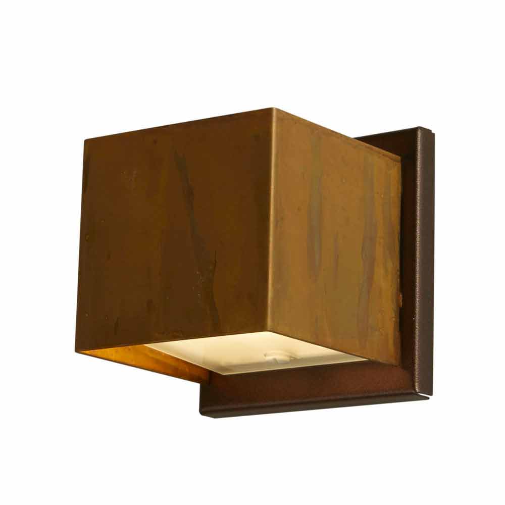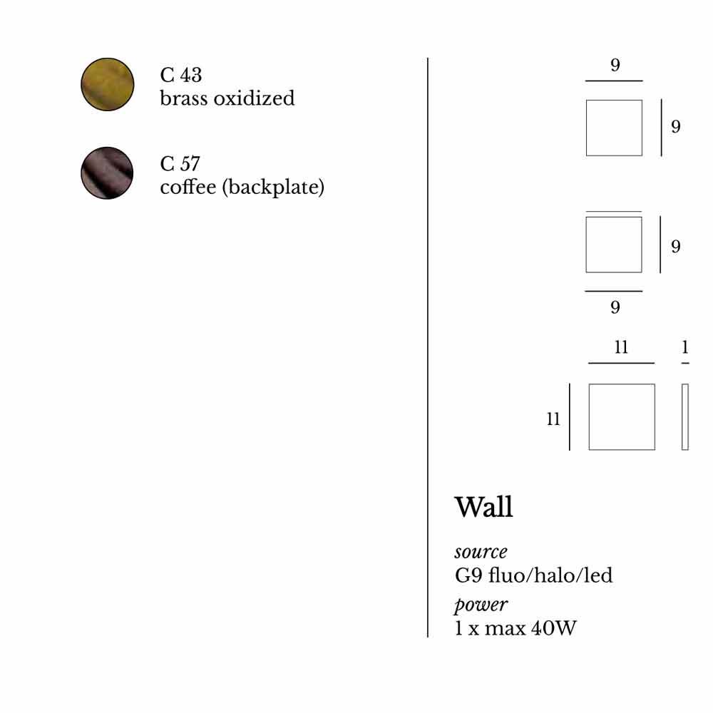 Wall lamp with structure in oxidized brass and sub-base in epoxy powder coated steel. Available in two sizes in the round or square shape. Tempered glass diffuser for direct and indirect light emission.