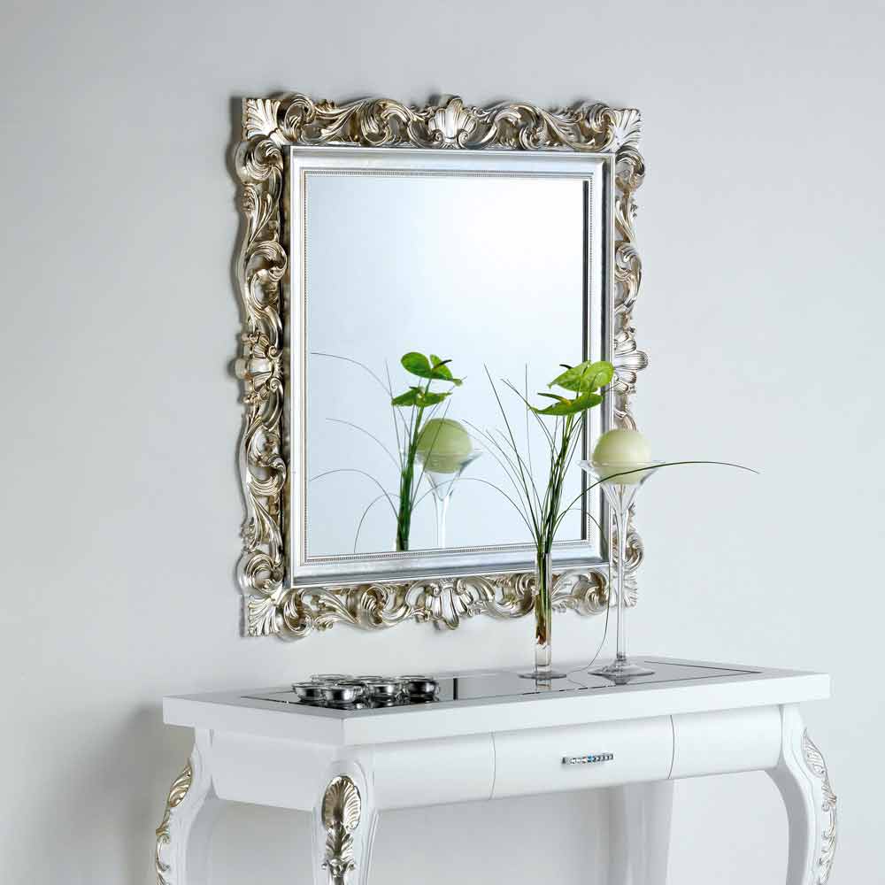 The Marsy mirror is characterized by a craftsmanship carried out using quality materials and using the experience of skilled Italian artisans. The frame is made of wood decorated with carvings. Silver leaf finish. Crystal mirror, 4mm thick. Made in Italy.