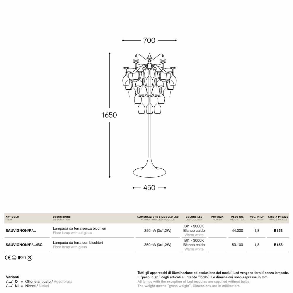 Designer floor lamp with 30 glasses Sauvignon, made in Italy