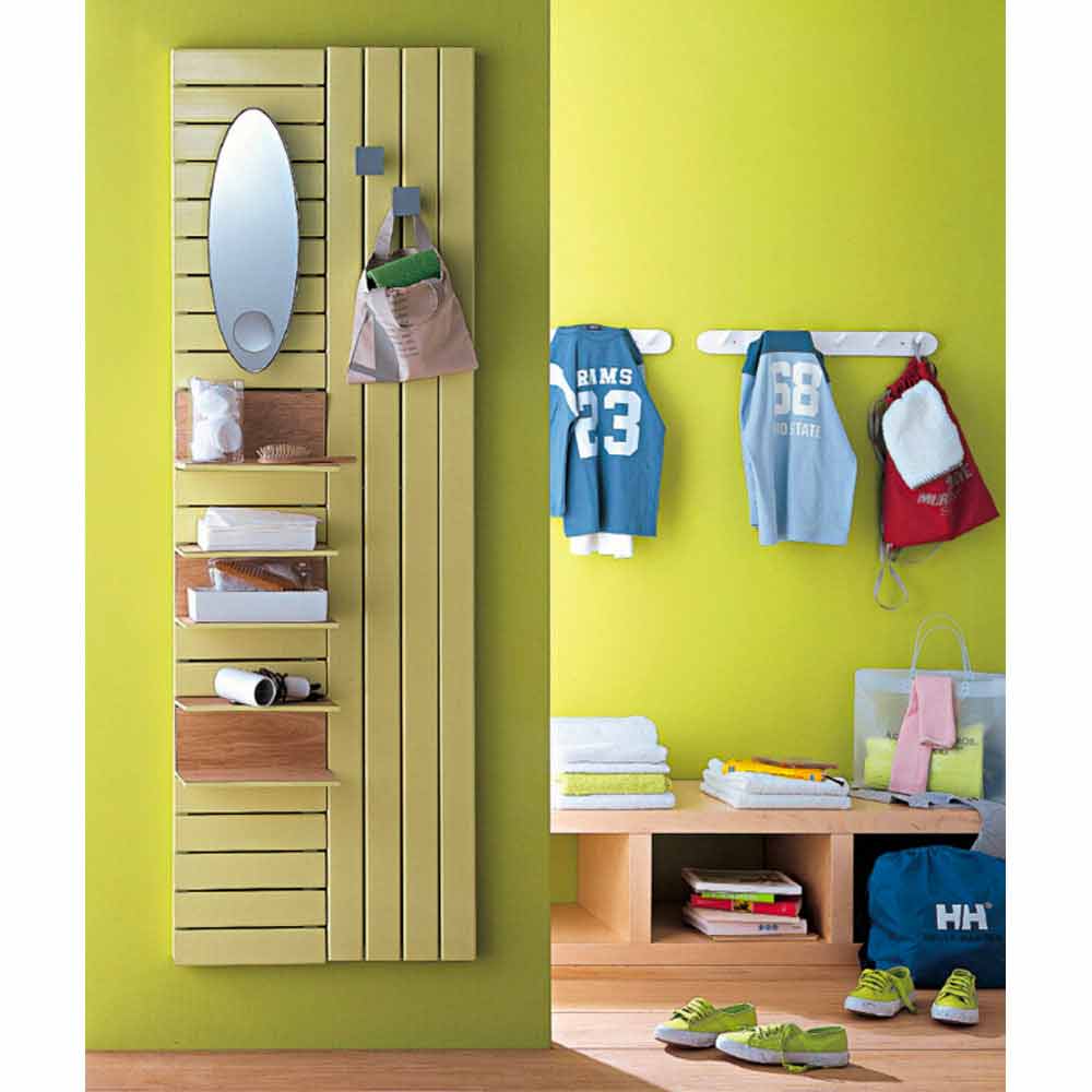 Hydraulic radiator, practical and functional with a linear design, heats and organises every environment in which it is inserted. Vertical radiator in colored steel, complete with shelves (as shown in the photo) with backrest-shelves and top in natural oak.