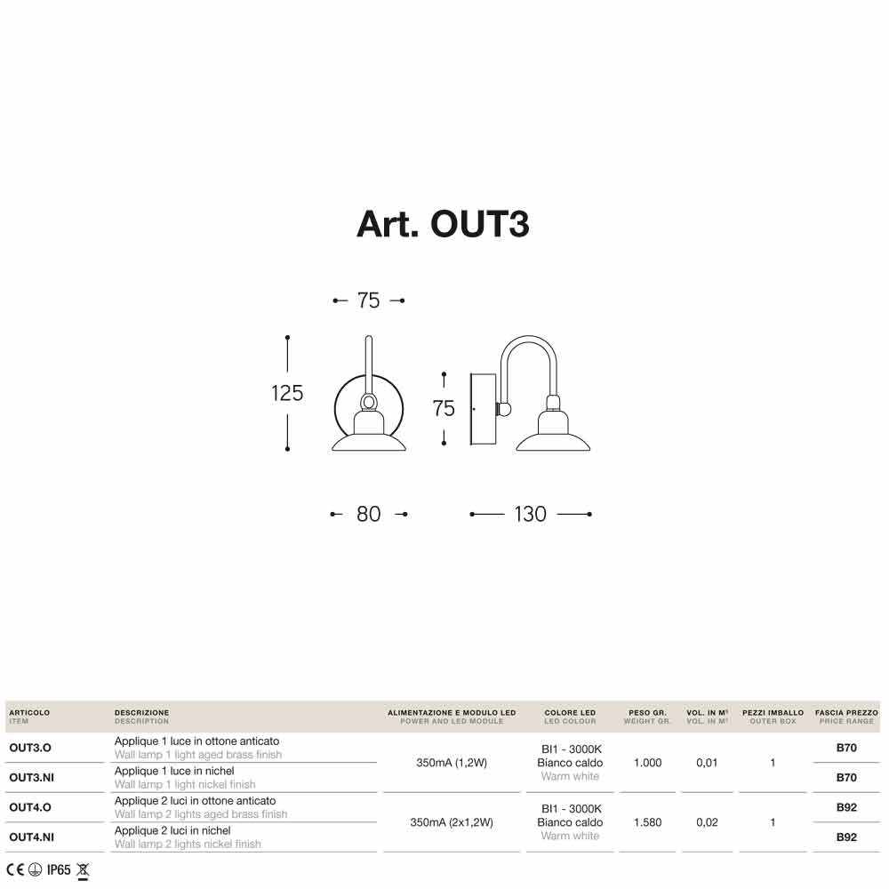 Designer wall sconce Bugatti by Aldo Bernardi , available with nichel or antiqued brass finishing.
