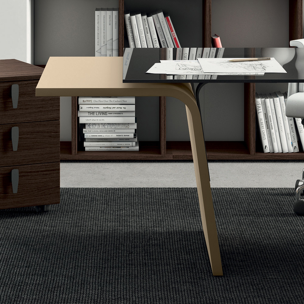 The main peculiarity of this desk lies in the particular finish of the top, elegant, in delicate contrast with the light finish of the legs.