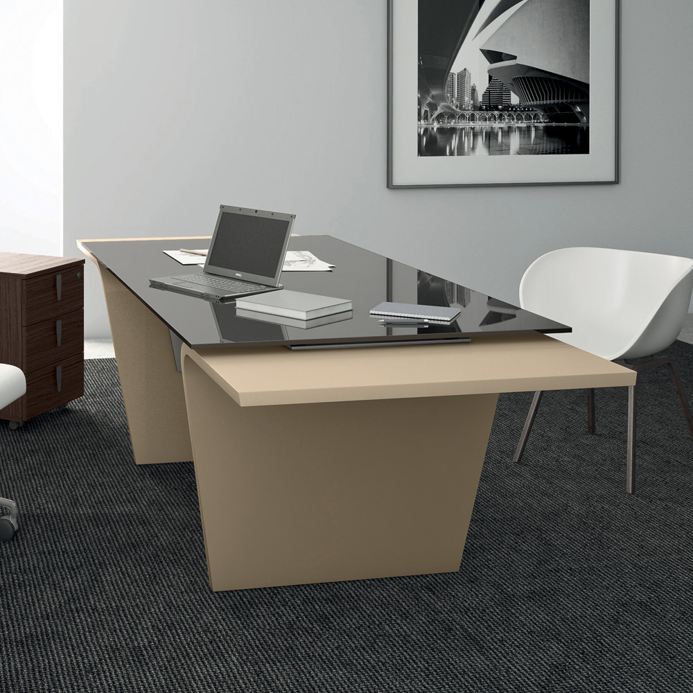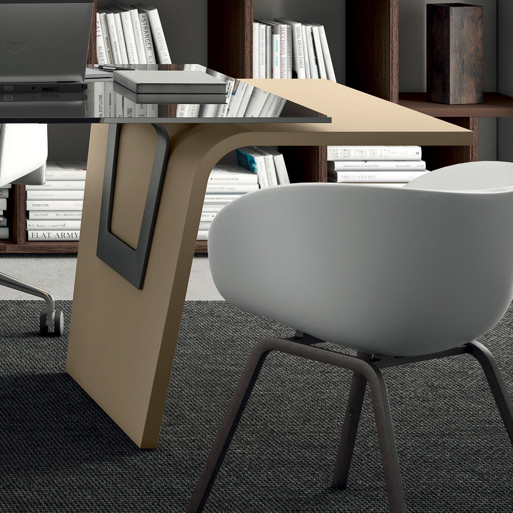This desk consists of a glass top in the chestnut finish, supported by a pair of non-aligned legs in lacquered Mdf in the RAL 1019 Grayish Beige finish, all joined by a pair of painted iron brackets in the burnished finish.