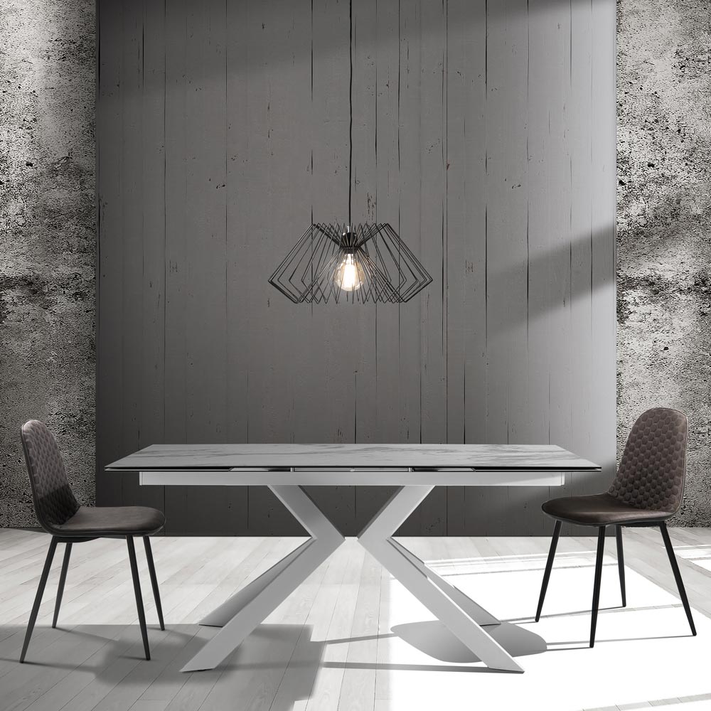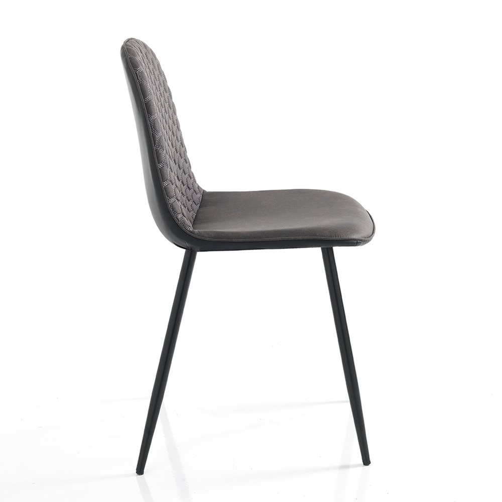 Dining room chair covered in aged velvet effect microfibre fabric with backrest in black synthetic leather and matt black painted metal structure. Enriching the simple aesthetics of the chair is the