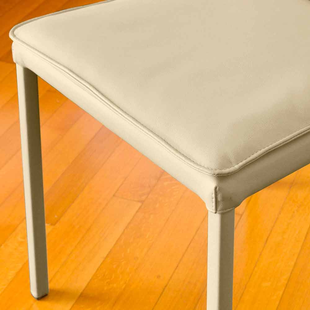 The legs have a geometric and square shape. The neutral shade of the dove-colored imitation leather covering, which completely covers the chair, makes it suitable for use in various furnishing contexts.