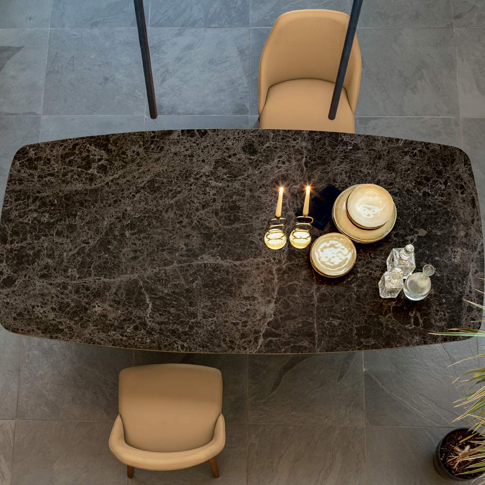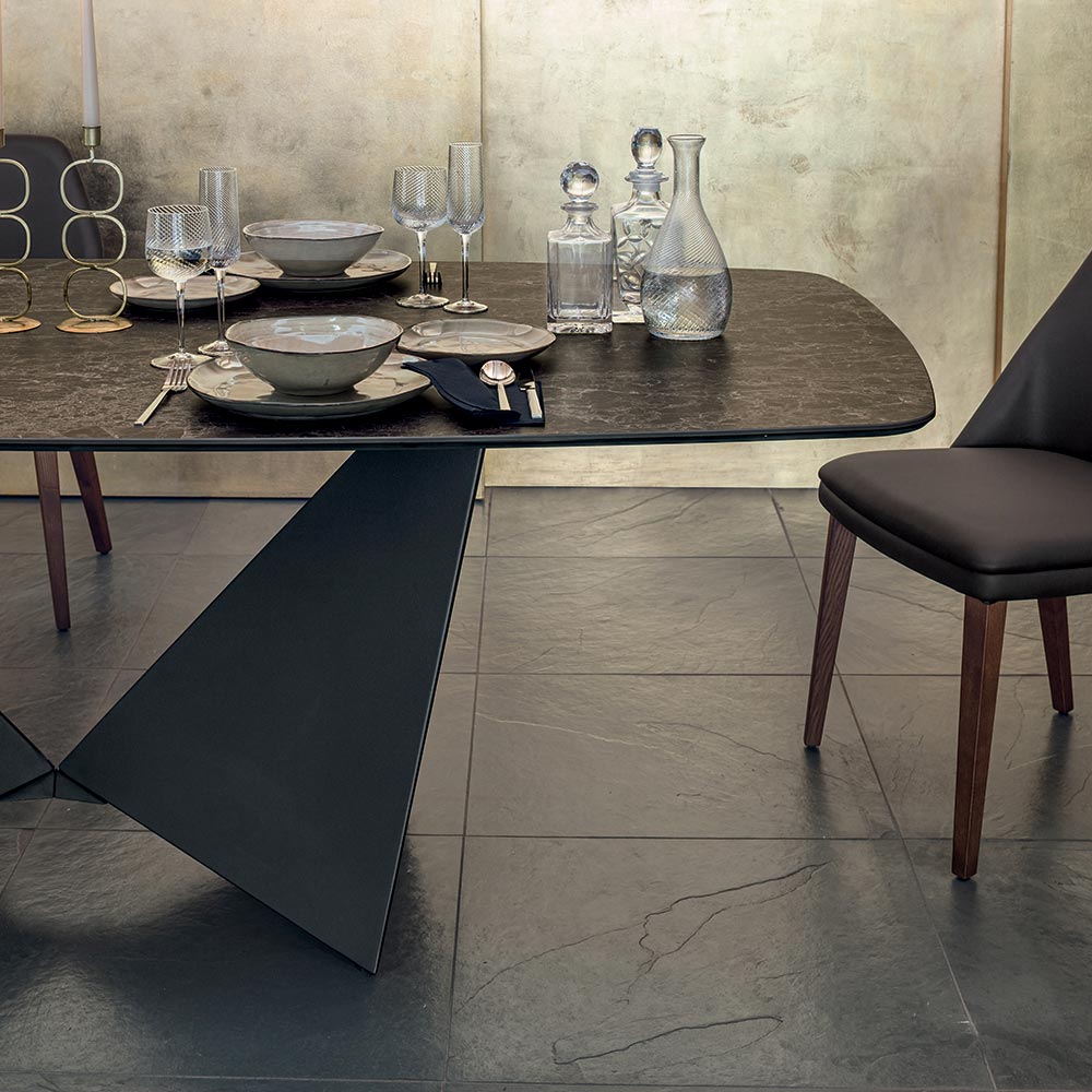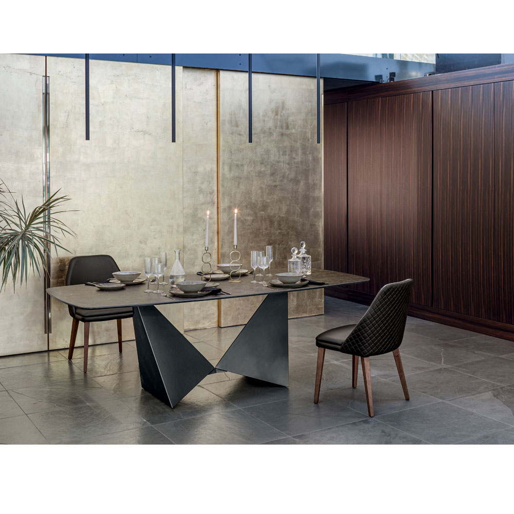 Dining table with metal base and matt ceramic top in various finishes made in Italy.
