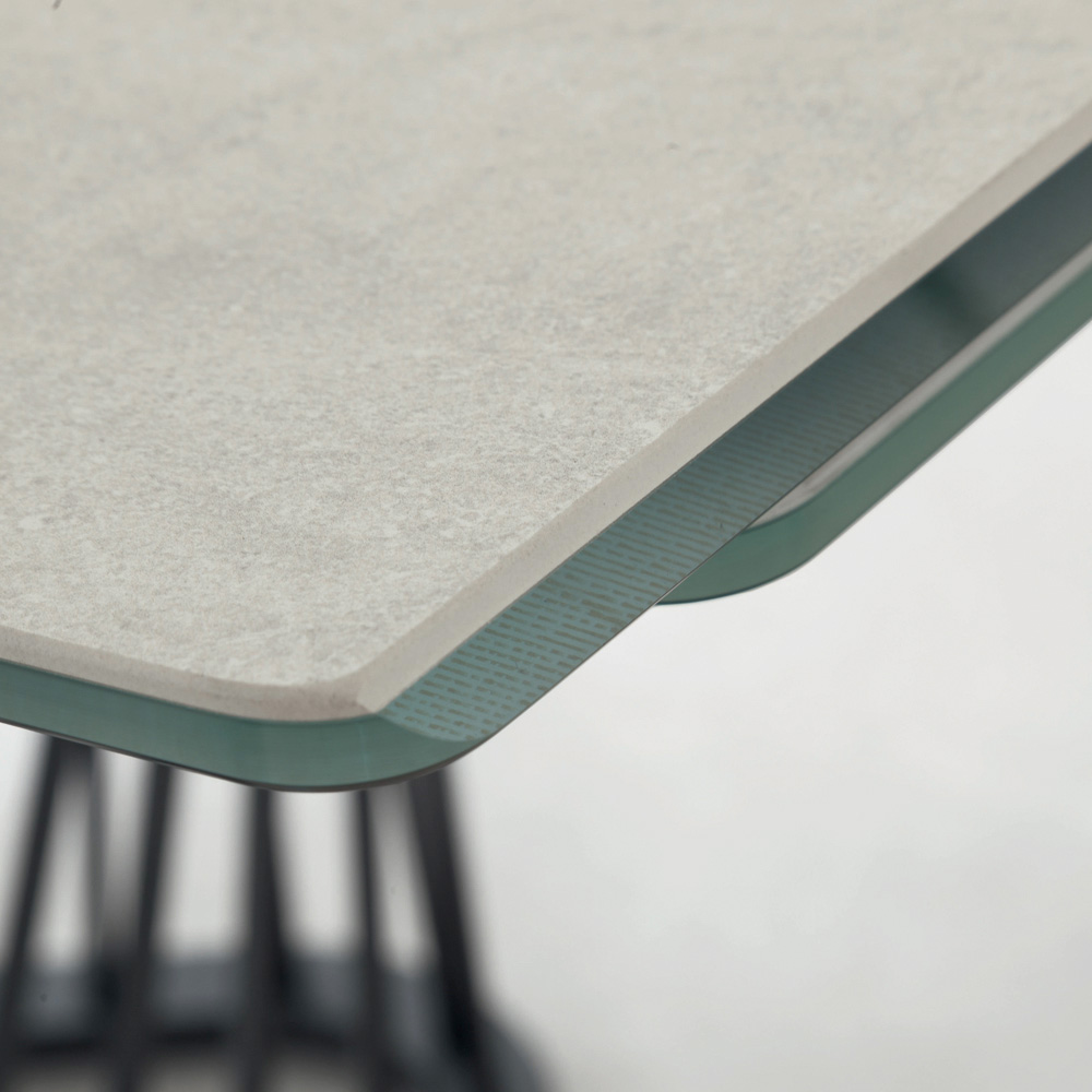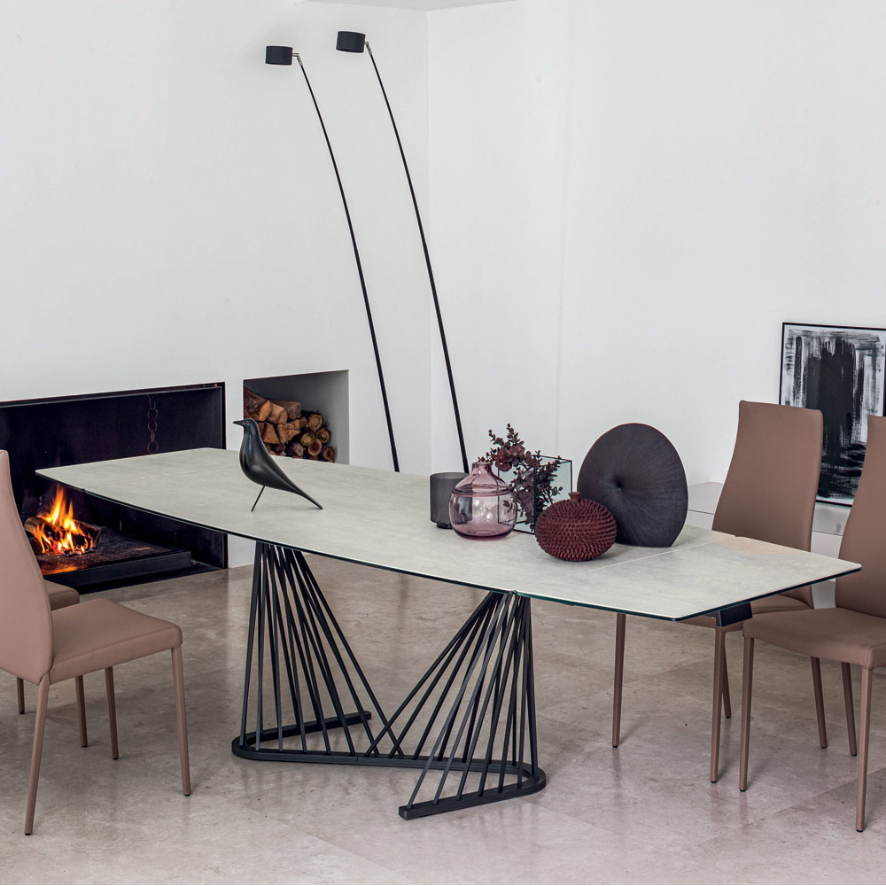 This extendable dining table has a structure with a square metal rod base powder coated in embossed graphite and a barrel-shaped top in opaque ceramic on glass with extensions placed under the top and extendable aluminum frame.
