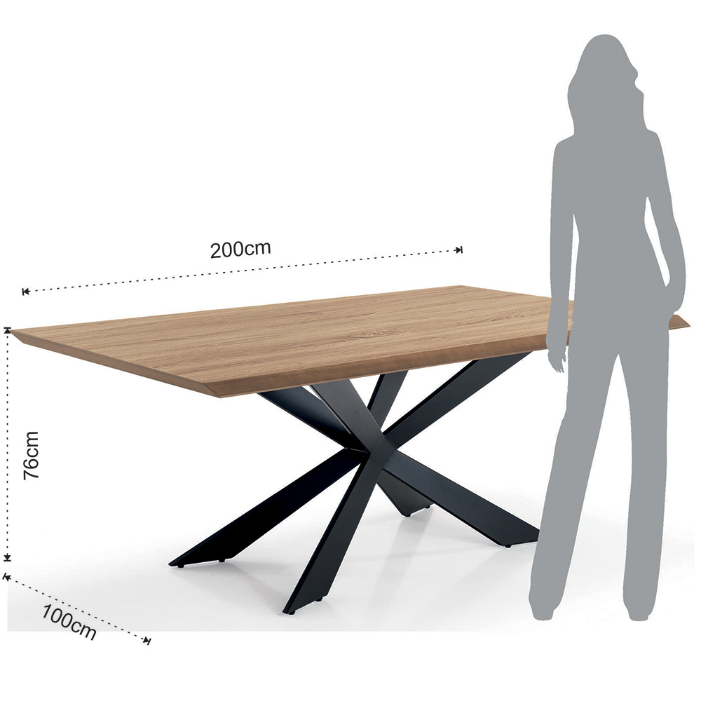 Dining table with top made of MDF veneered in oak finish and base in matt black painted metal . A product with a linear design enriched by the particular shape of the base which represents the glass, the strong point of the table. The wonderful finishes chosen complete the final look, giving a touch of elegance and a sense of innovation while ensuring a solid, resistant and good quality complement . The result is a dining table with a contemporary style , ideal for those who love furnishing their home spaces with personality and character .