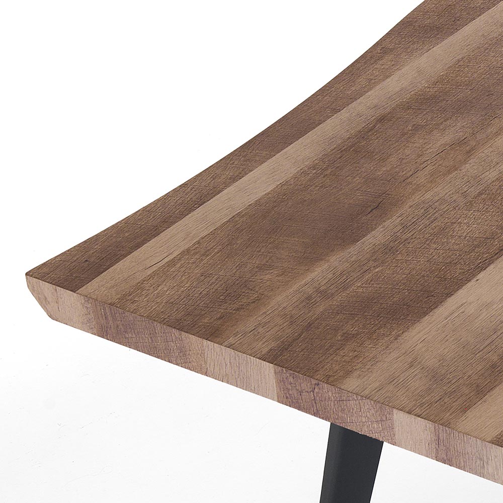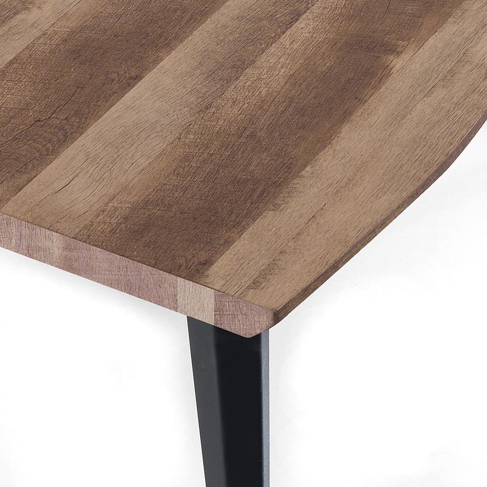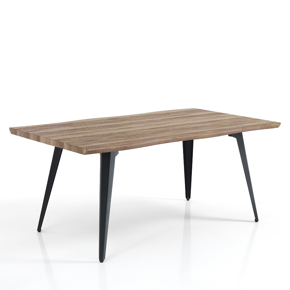 Dining table with top made of MDF covered in melamine in plank oak finish (thickness 4cm) and legs with adjustable feet made of matt black painted steel . A complement with a minimal and modern style designed to furnish any living space in an essential way, bringing with it functionality and elegance . The combination of finishes and materials chosen enriches the product with personality and allows it to ensure solidity, stability and excellent durability over time . The result is therefore a cutting-edge dining table characterized by a marked versatility of use capable of completing any domestic or contract situation with personality.