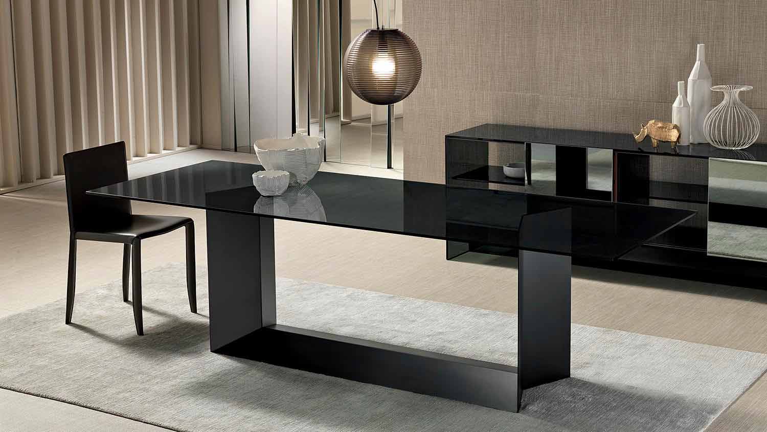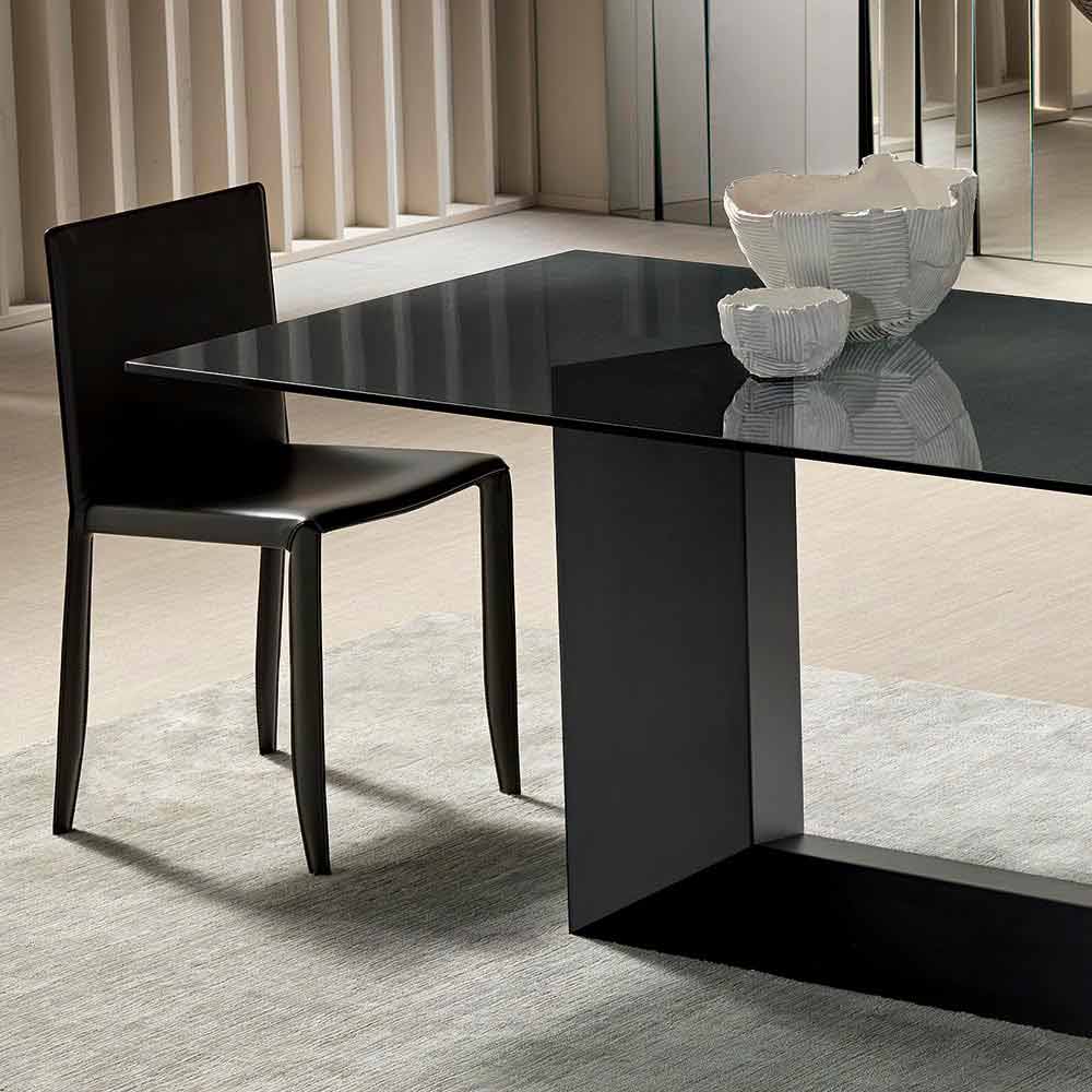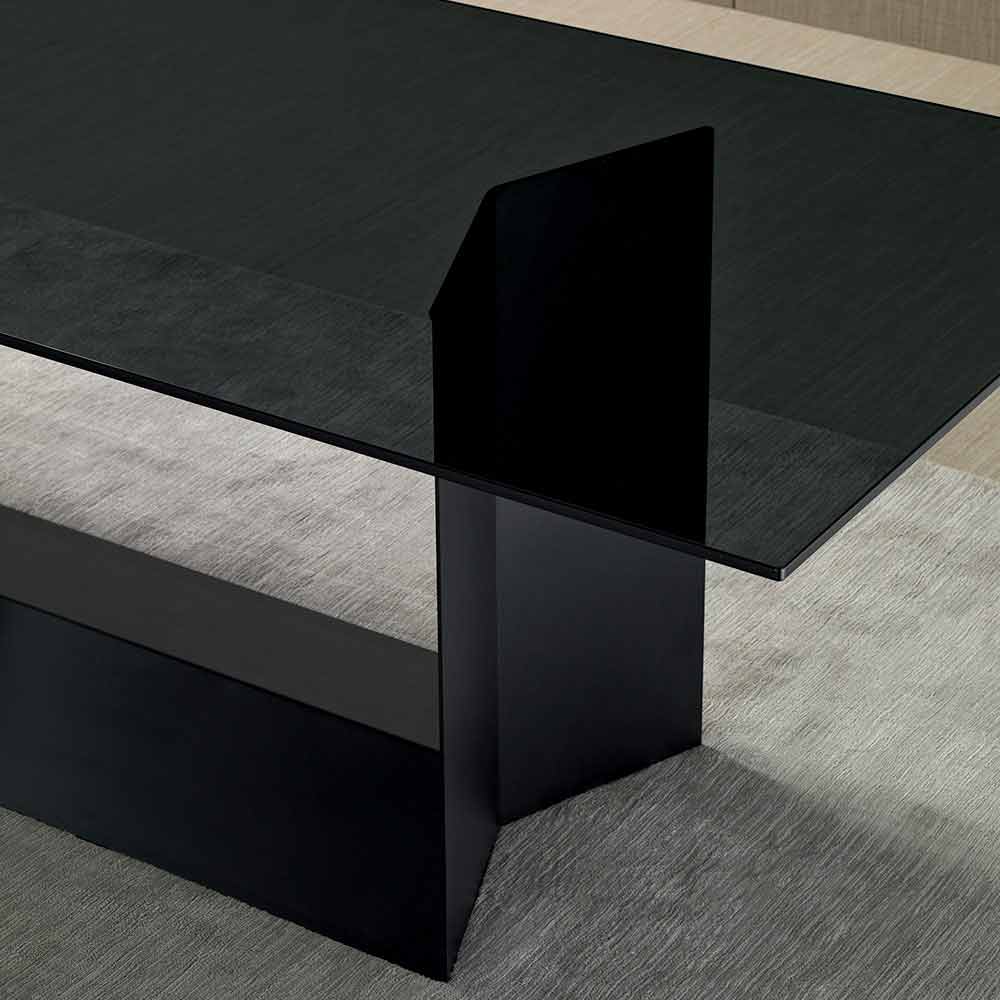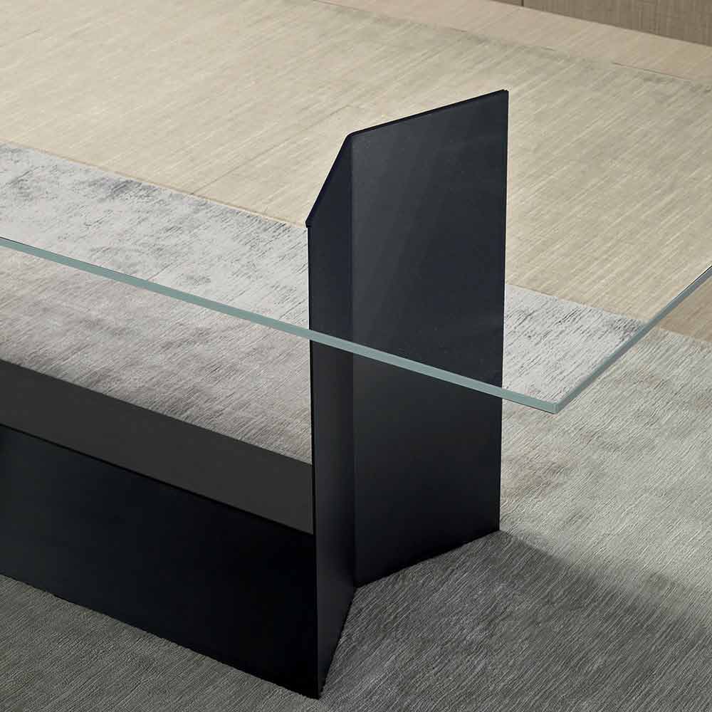 Luxury table with smoked or extra-clear glass top and matt graphite black metal base, made in Italy.